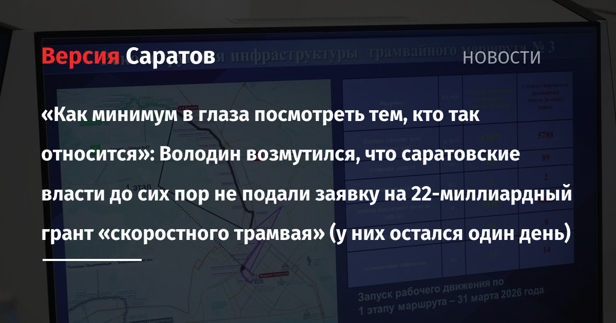 - Володин: завтра регион подаст заявку на новый грант для строительства «скоростного трамвая» в Саратове