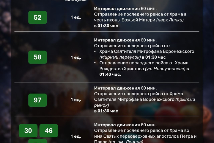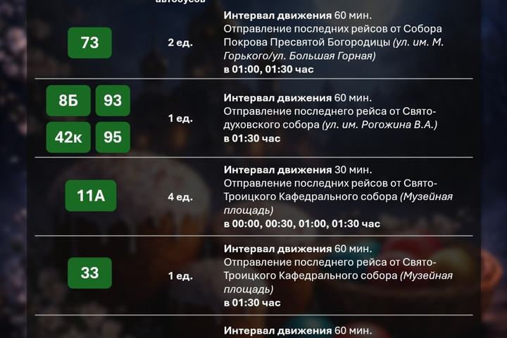 Как теперь рассказали администраторы канала, на 14 автобусных маршрутах — № 73, 8Б, 93, 42к, 95, 11А, 33, 105, 52, 58, 97, 30, 46, 74 — будут работать суммарно 19 автобусов. Также будет продлена работа троллейбусных маршрутов № 2, 5, 7, 10, 11, 15, трамвайных маршрутов № 9Д и № 10. Режим работы каждого маршрута можно посмотреть в прикреплённых ниже карточках.