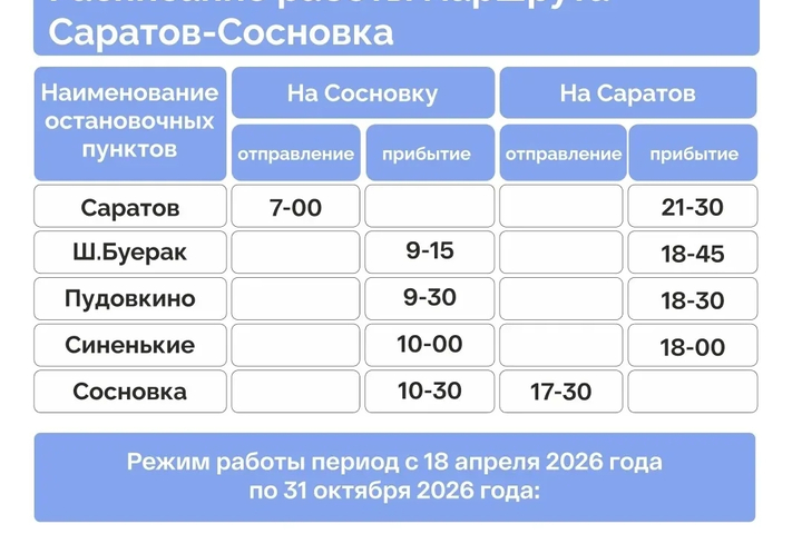 В министерстве опубликовали расписание маршрутов «Хвалынск — Духовницкое», «Саратов — Шумейка», «Саратов — Сосновка». С ними можно ознакомиться в карточках ниже.