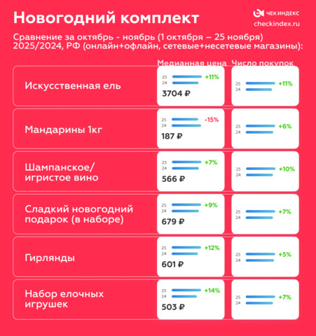 Аналитики «Чек.Индекс» подсчитали, во сколько в 2025-м обойдется «новогодний комплект». В последний они включили искусственную елку, набор игрушек и гирлянды для украшения, мандарины, игристое вино или шампанское и сладкий новогодний подарок.