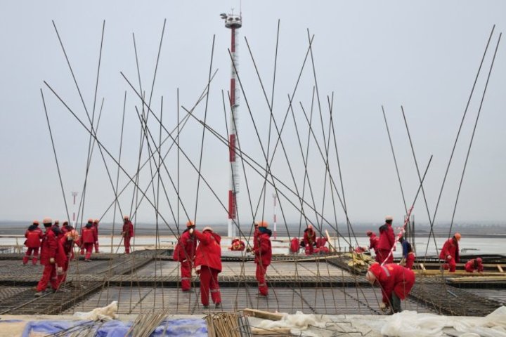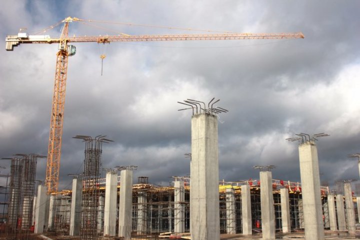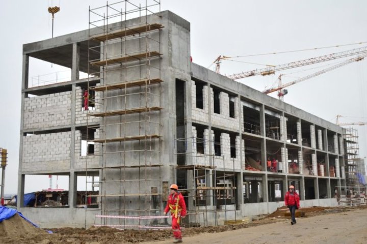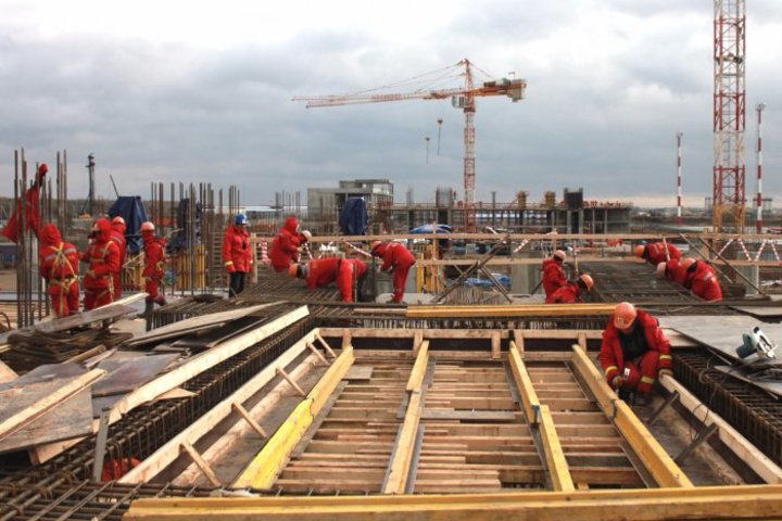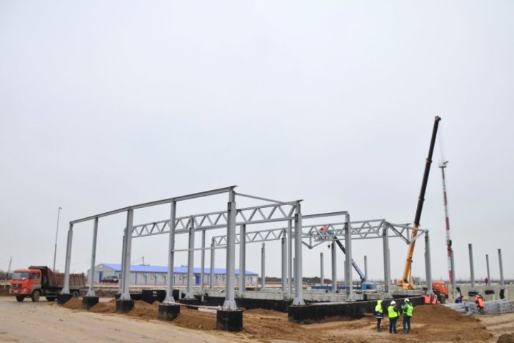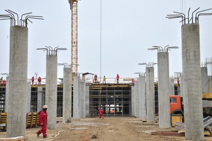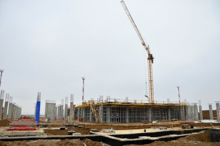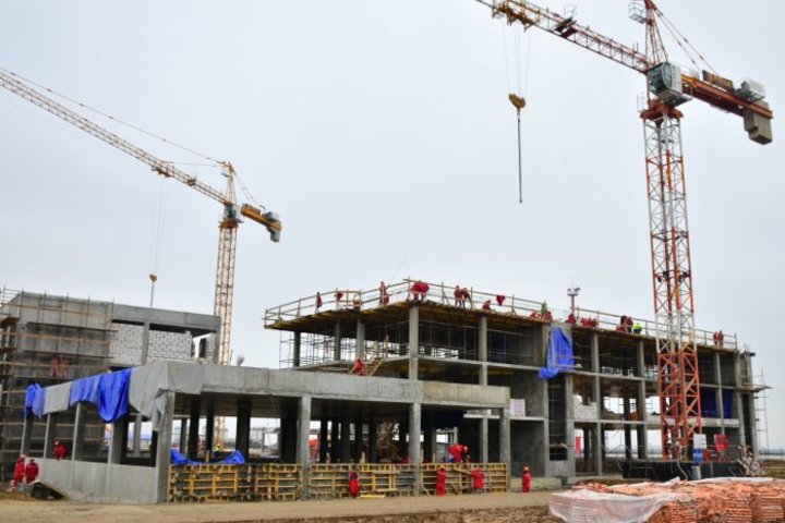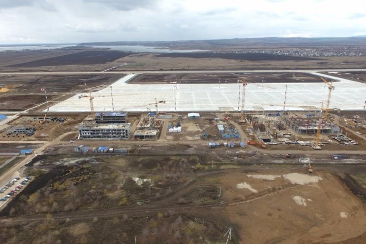Возведением пассажирского терминала и других зданий занимаются 580 строителей, привлечено 35 единиц техники, в том числе 5 башенных кранов.