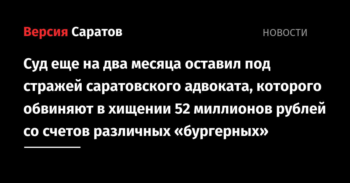 Суд еще на два месяца оставил под стражей саратовского адвоката, которого обвиняют в хищении 52 миллионов рублей со счетов различных «бургерных»