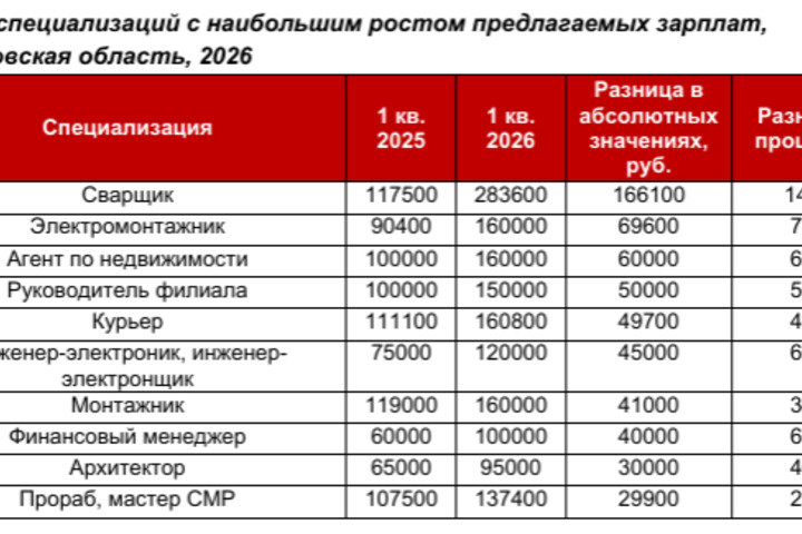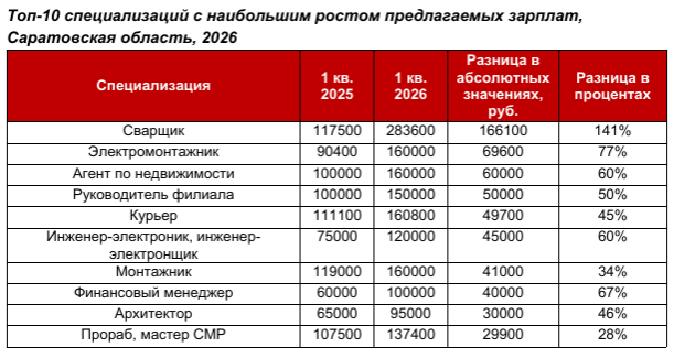 Эксперты hh.ru провели анализ рынка труда Саратовской области и выяснили, у представителей каких направлений в первом квартале 2026 года предлагаемая зарплата выросла заметнее всего. Рейтинг специализаций возглавили сварщики, электромонтажники и агенты по недвижимости.