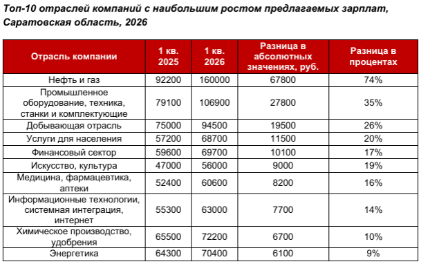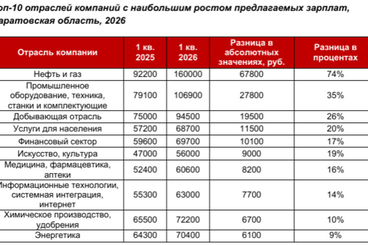 В «разрезе» отраслей самыми щедрыми в вопросе роста предлагаемых зарплат в вакансиях в Саратовской области оказались нефть и газ (+74%), промышленное оборудование, техника, станки (+35%), добывающая отрасль (+26%), услуги для населения (+20%), а также финансовый сектор (+17%).