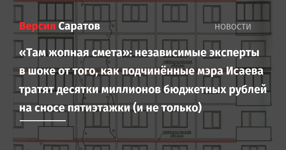 «Там жопная смета, — отметил один из собеседников издания. — То есть, не понятно, как будет «закрываться» какой-то будущий подрядчик, который это выиграет. Если посмотреть смету, то в ней на разборку сантехнических систем заложено около 23 миллионов! То есть, основная часть заложенных средств из 37 миллионов — на демонтаж батарей, труб, сантехнического оборудования, всего того, чего там, скорее всего, уже давно и так нет. И ведь за этот демонтаж подрядчик обязан будет отчитаться.