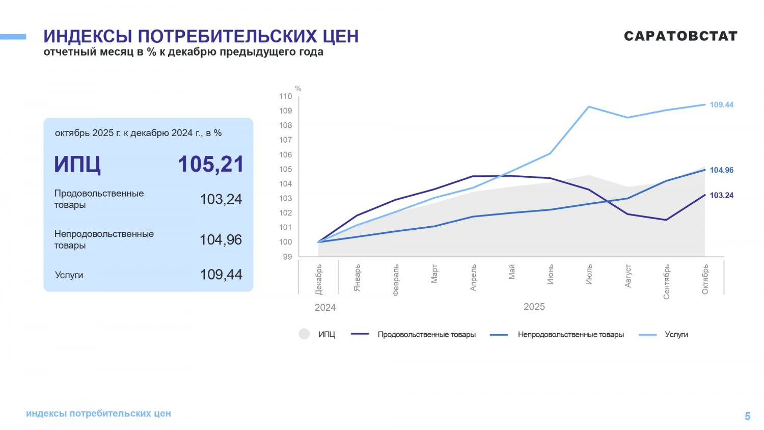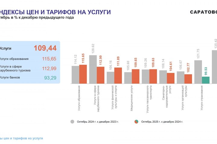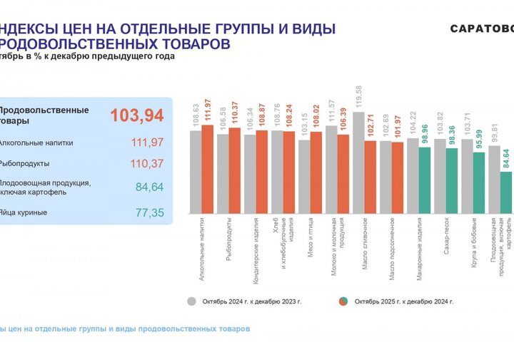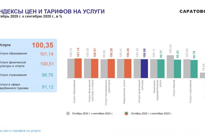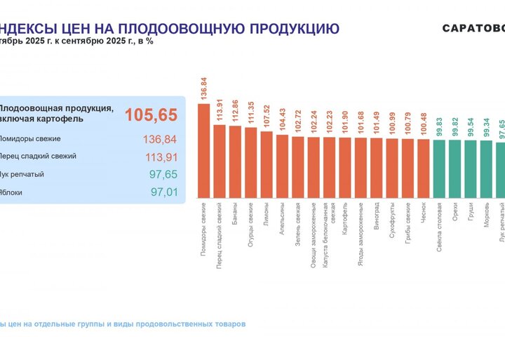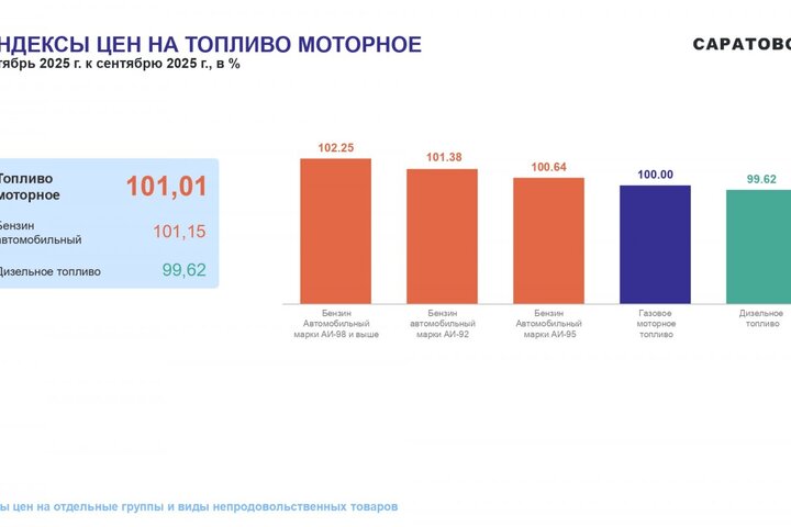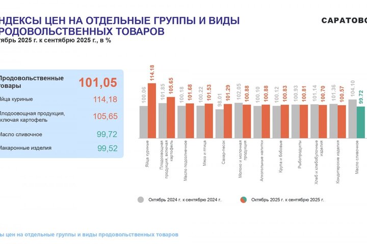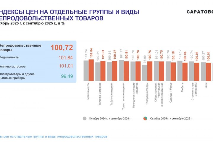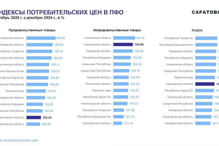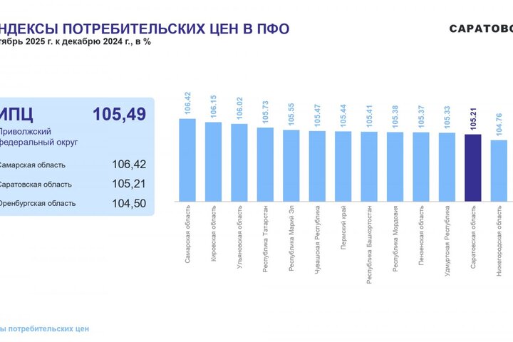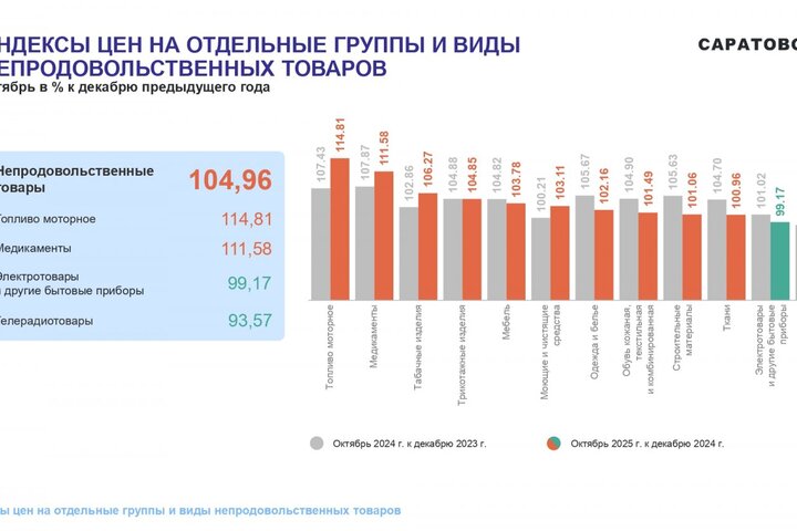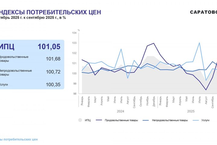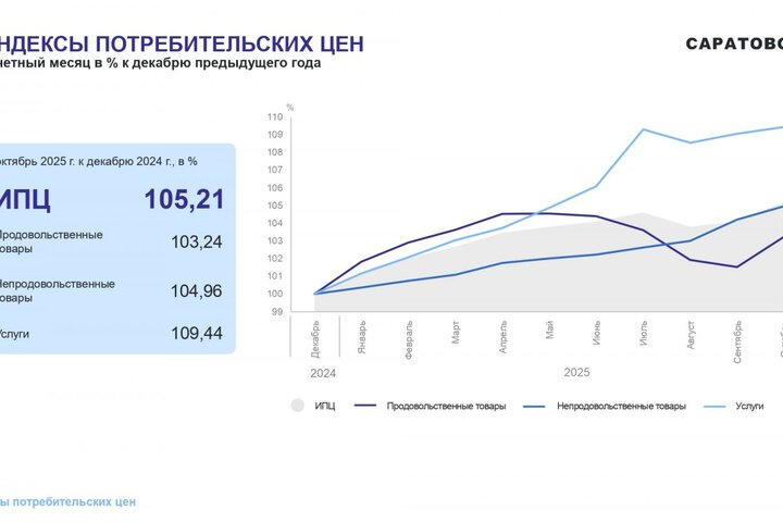 Потребительские цены в октябре 2025 года повысились по сравнению с сентябрем 2025 года на 1,05%, по сравнению с декабрем 2024 года повысились — на 5,21%. По индексу потребительских цен Саратовская область — третья с конца в ПФО. Самая высокая инфляция в Самарской области (6,42%), самая низкая — в Оренбургской области (4,5%).