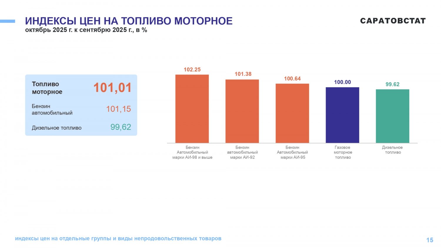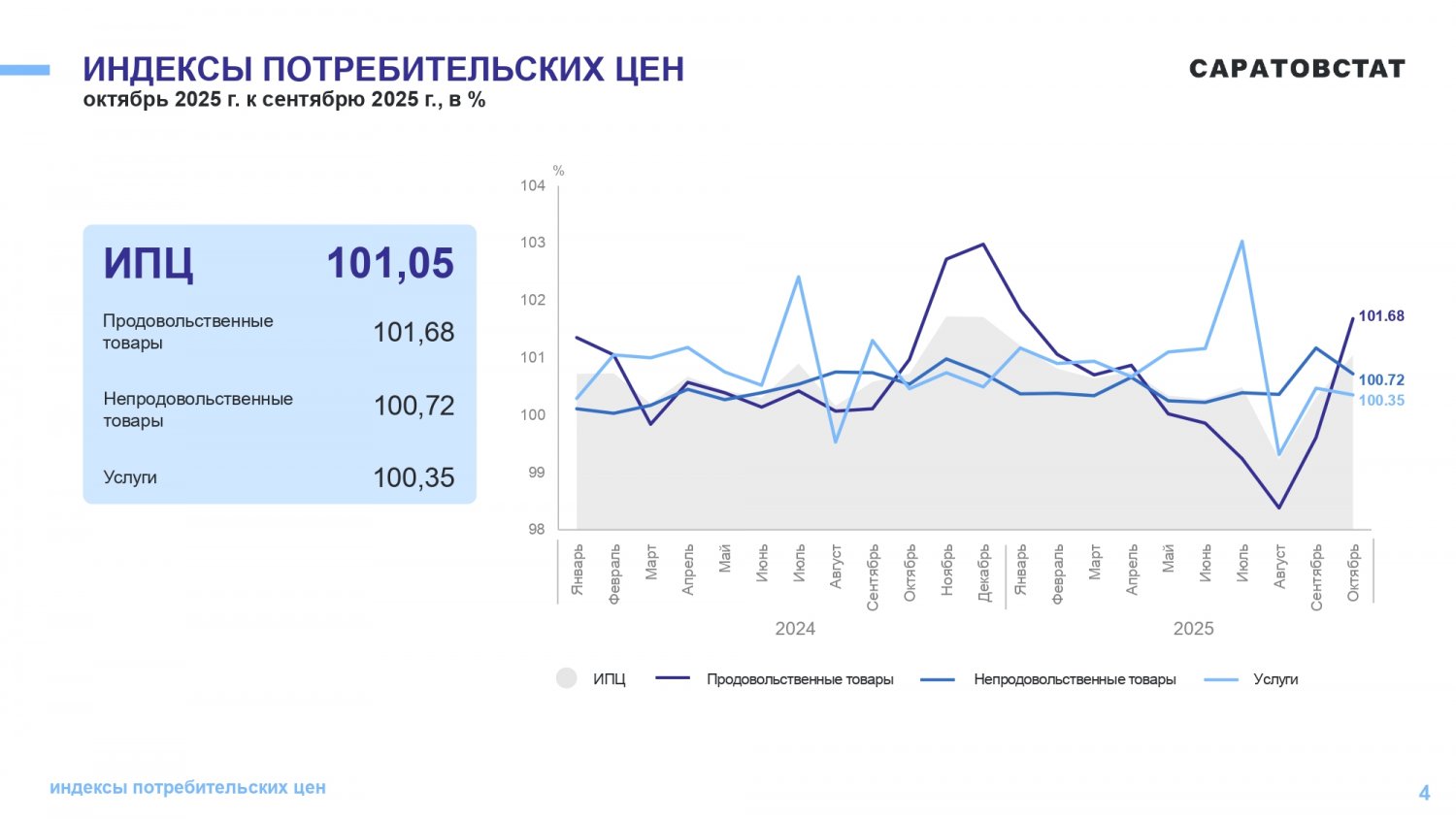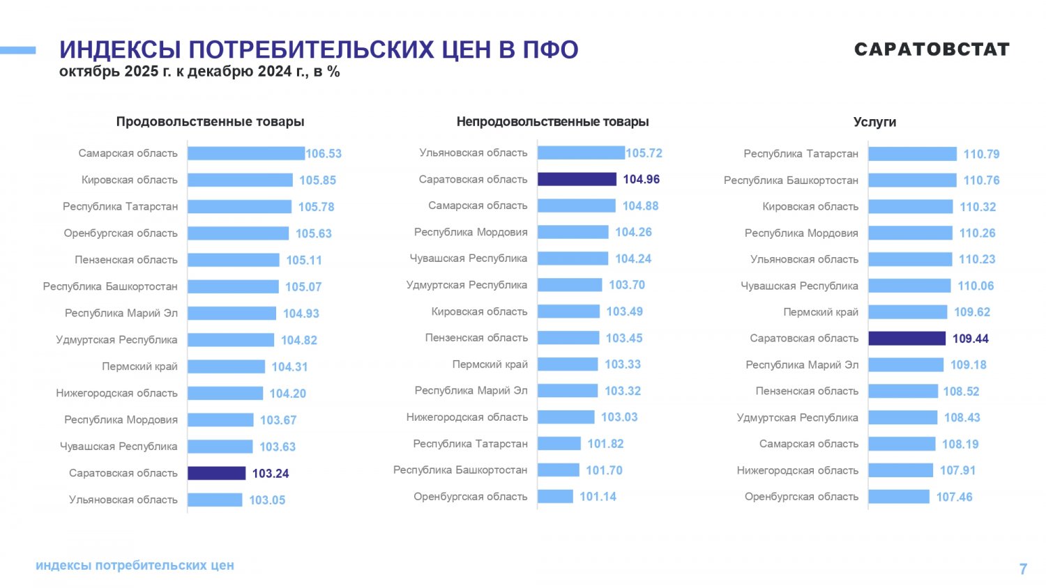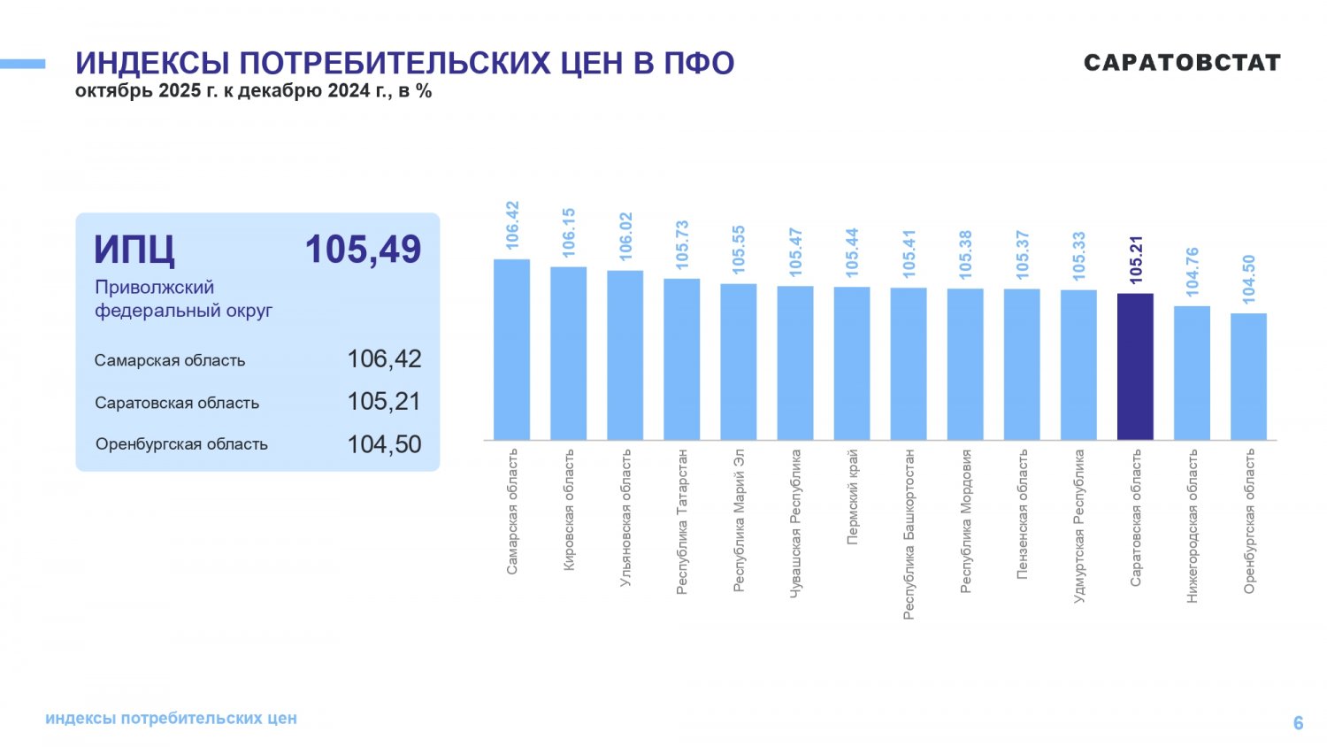 Потребительские цены в октябре 2025 года повысились по сравнению с сентябрем 2025 года на 1,05%, по сравнению с декабрем 2024 года повысились — на 5,21%. По индексу потребительских цен Саратовская область — третья с конца в ПФО. Самая высокая инфляция в Самарской области (6,42%), самая низкая — в Оренбургской области (4,5%).