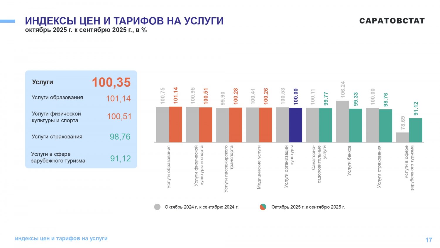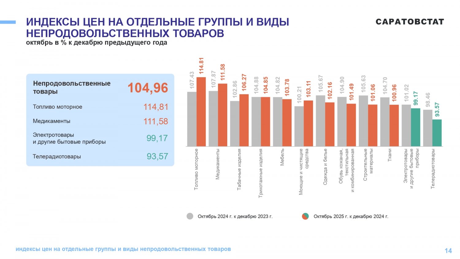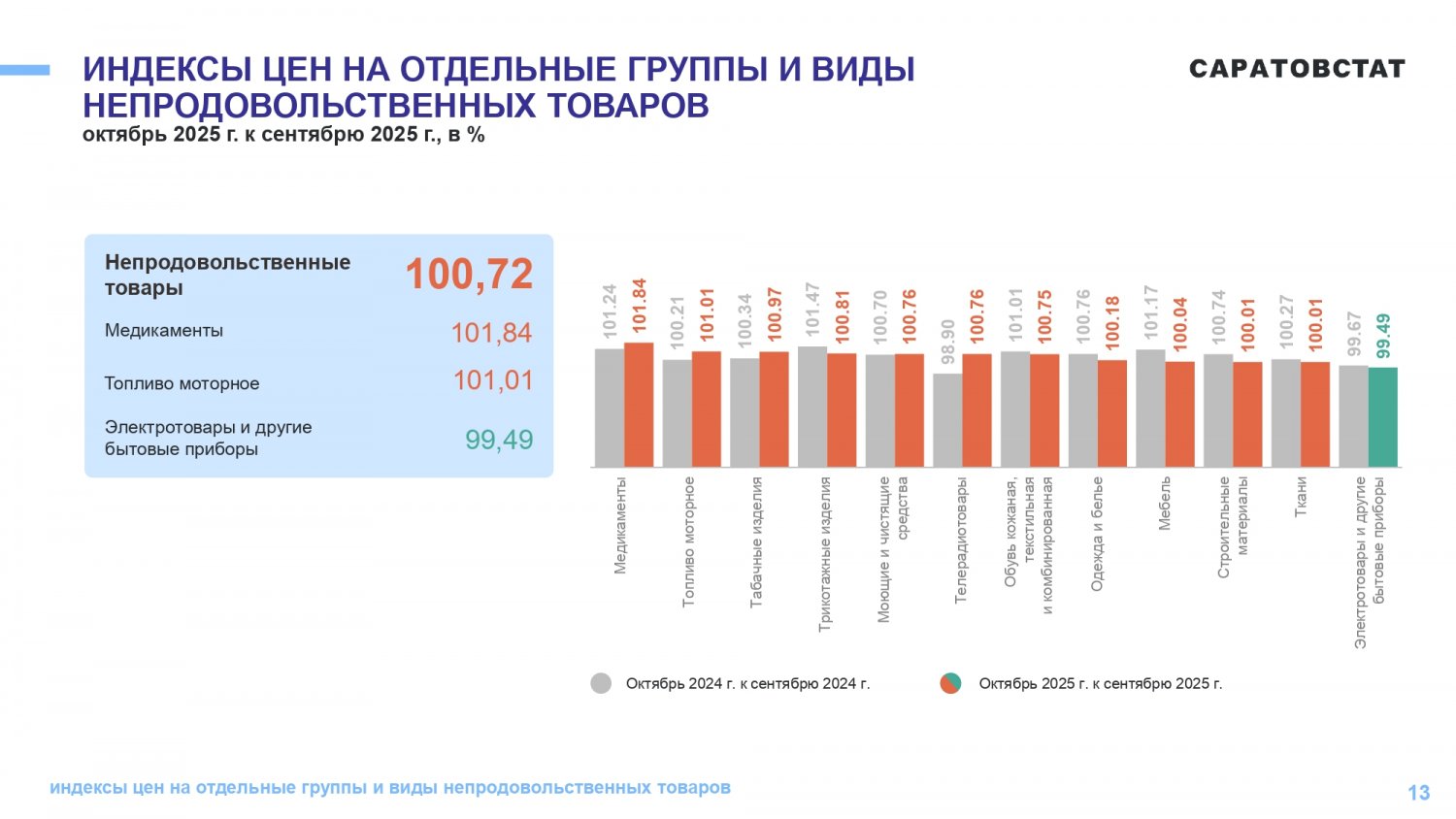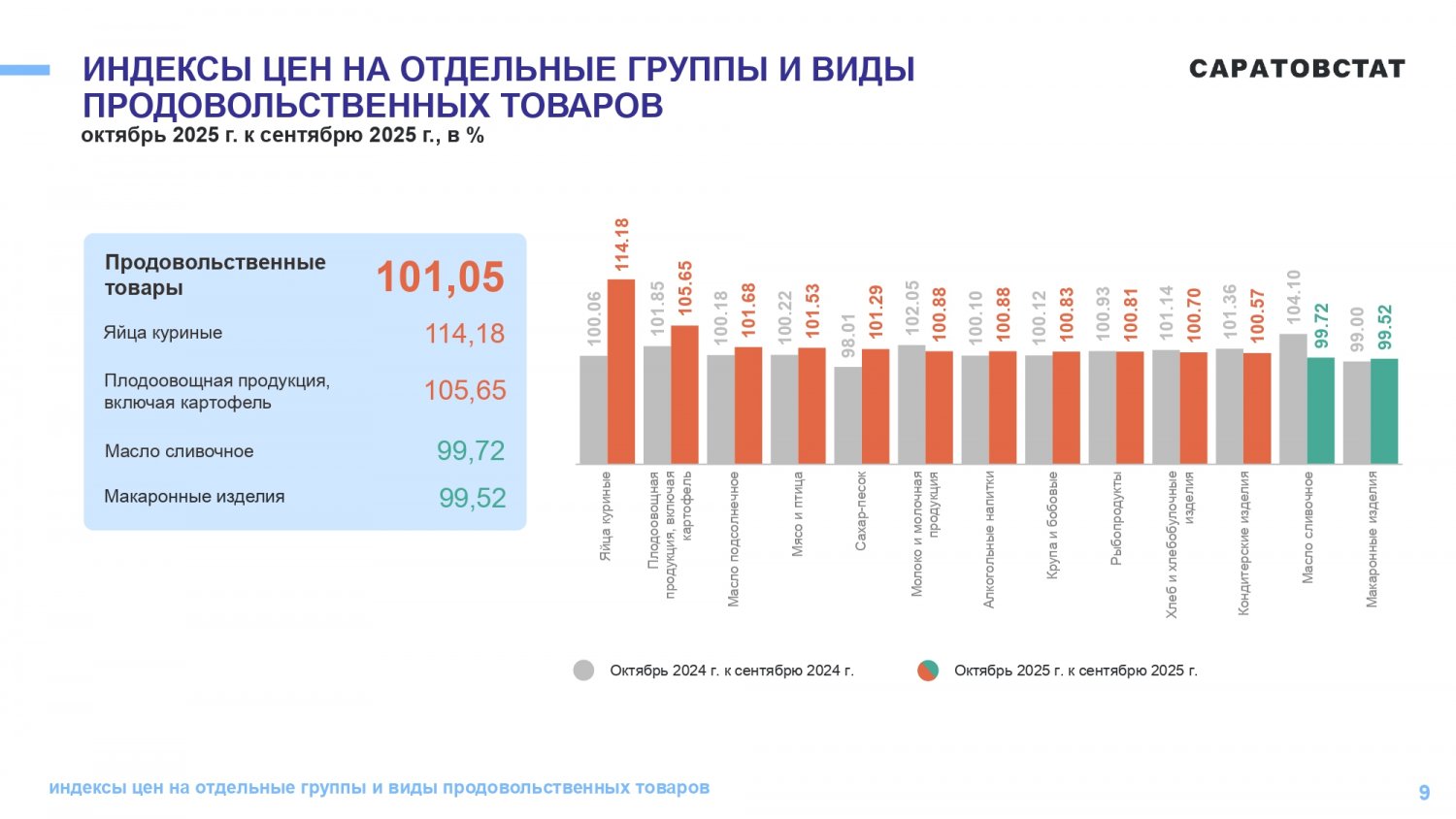 Потребительские цены в октябре 2025 года повысились по сравнению с сентябрем 2025 года на 1,05%, по сравнению с декабрем 2024 года повысились — на 5,21%. По индексу потребительских цен Саратовская область — третья с конца в ПФО. Самая высокая инфляция в Самарской области (6,42%), самая низкая — в Оренбургской области (4,5%).
