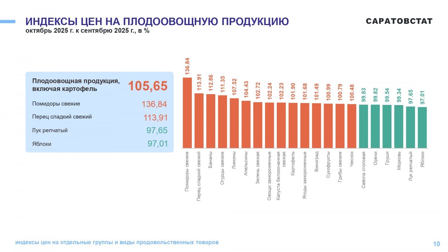 В октябре лидерами по росту цен среди продуктов стали яйца. После значительного снижения они подорожали на 14,18% за месяц. На втором месте — плодоовощная продукция, в том числе картофель (+5,65%). Наиболее значительно подорожали помидоры (+36,84%) и сладкий перец (+13,91%).