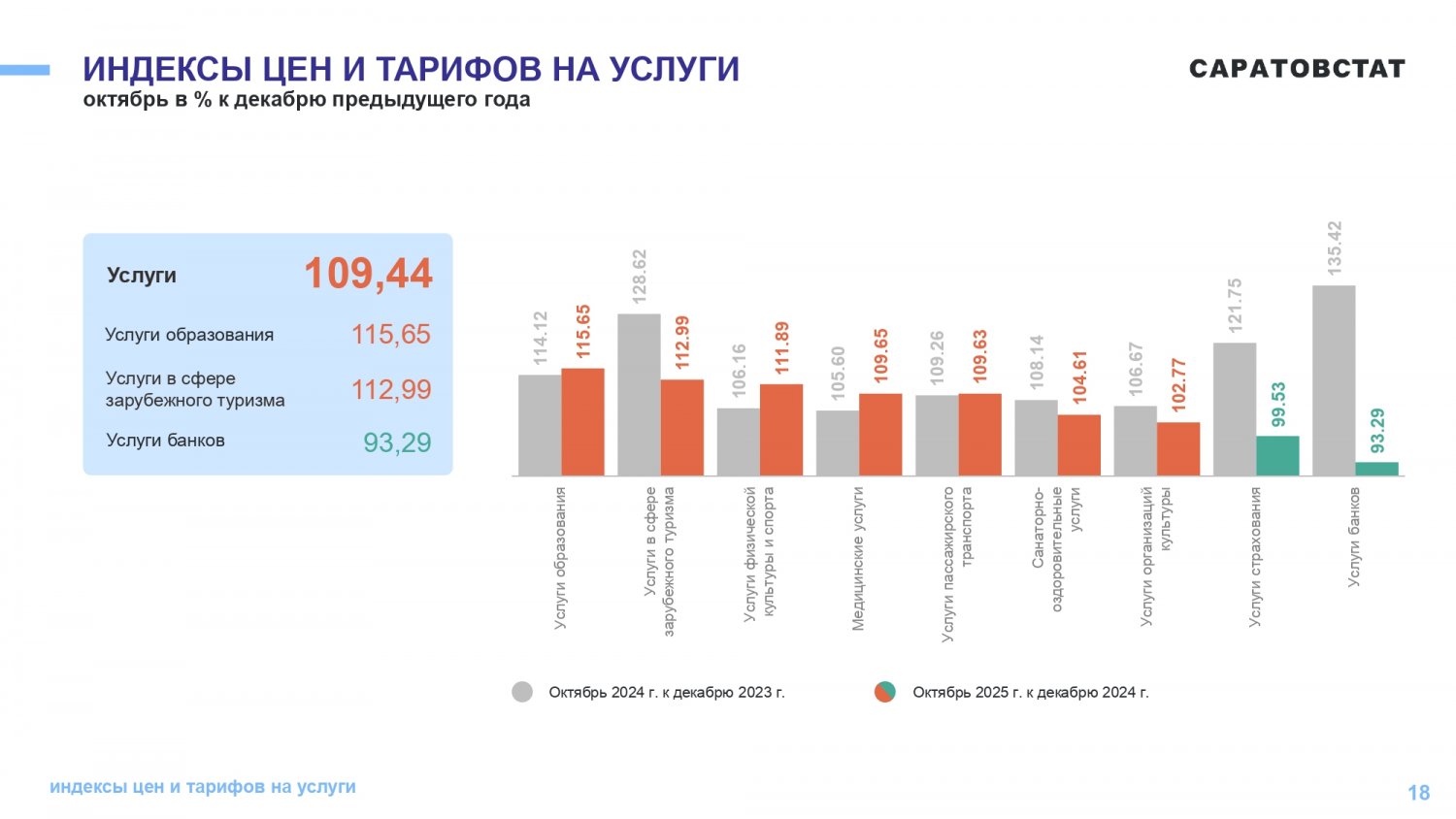 Продовольственный товары за 10 месяцев подорожали на 3,24%, непродовольственные — на 4,96%, услуги — на 9,44%. Из продовольственных товаров лидерами по подорожанию за январь–октябрь стали алкогольные напитки (+11,97%) и рыбопродукты (+10,37%). Из непродовольственных наиболее значительно с начала года подорожали моторное топливо — на 14,81% и медикаменты — на 11,58%. В сфере услуг наиболее повысились цены на образование (+15,65%) и услуги в сфере зарубежного туризма (+13%).