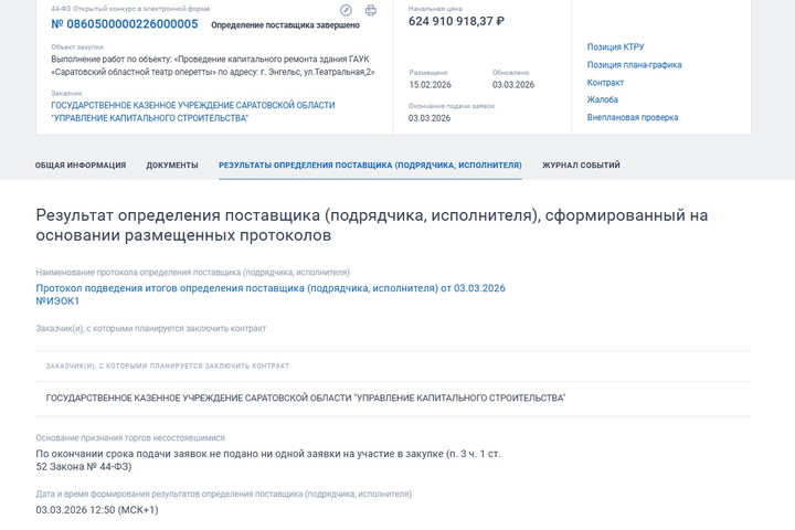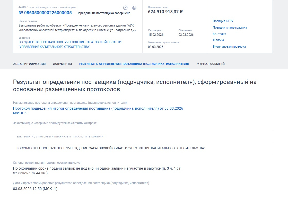 Вчера, 3 марта, выяснилось, что после окончании срока подачи заявок не подано ни одной заявки на участие в закупке. На основании этого торги были признаны несостоявшимися.