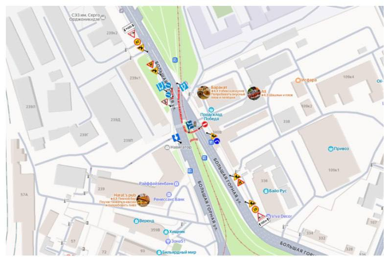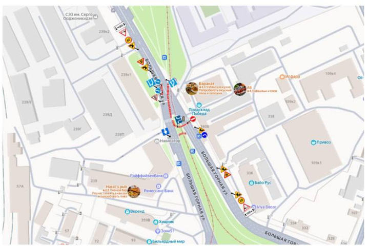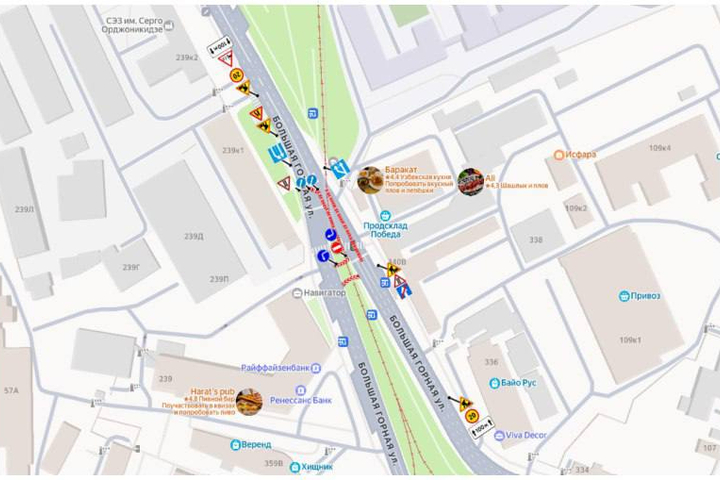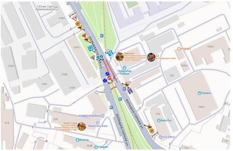 Отметим, что сейчас перекрыта одна сторона Большой Горной — на развилке от съезда с моста в сторону центра. На месте выставлены ограждения, которые перенаправляют поток машин с отдельной полосы через место, где раньше были трамвайные пути, в полосу потока, следующего на проспект 50 лет Октября. Ширина полосы равна ширине автобуса.