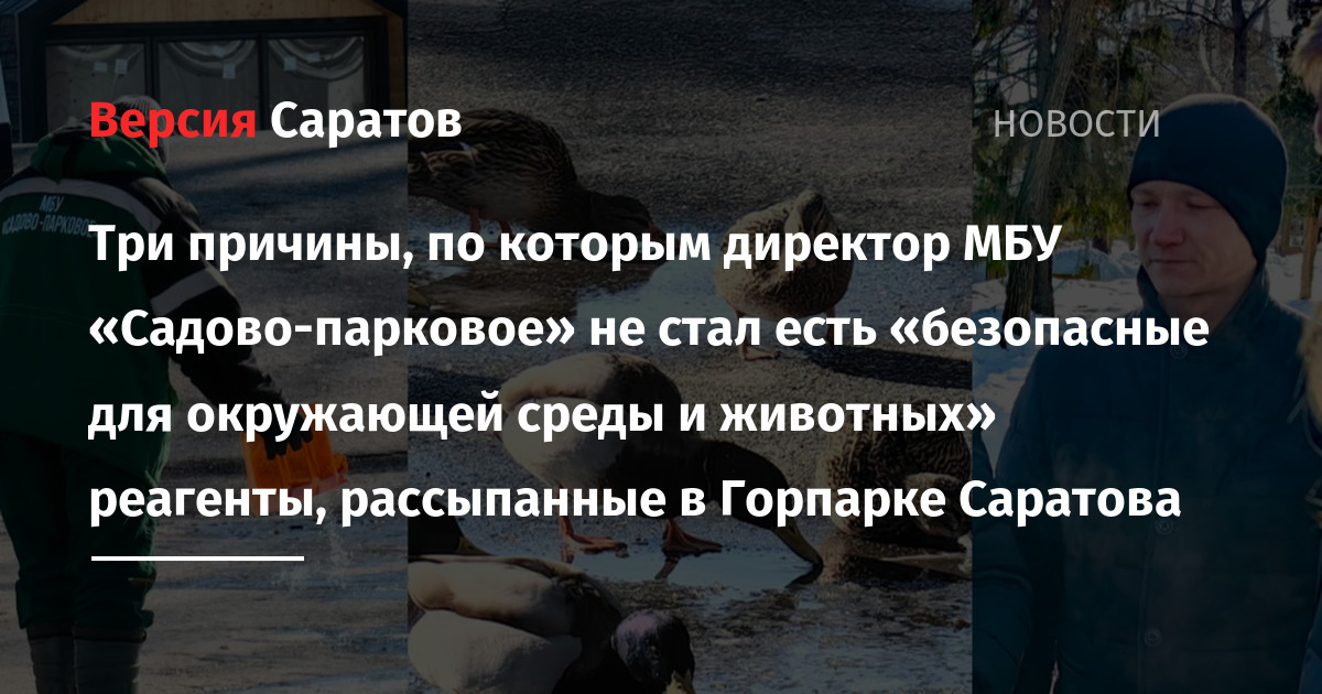 Первая причина — никто не попросил его об этом. Вторая причина — директор МБУ сам не предложил такой способ доказательства безопасности используемых материалов. Ну, а третья причина, надо полагать, это содержание в реагентах хлоридов натрия и кальция, которые, по мнению учёных, могут привести к «негативным эффектам» для живых существ, а по мнению врачей — к промыванию желудка.