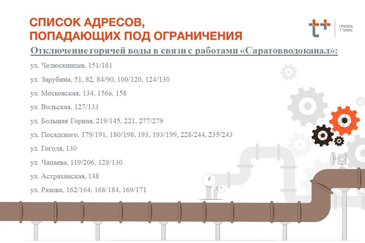 «Кроме того, в связи с работами „Саратовводоканал“, на водопроводных коммуникациях с отключением холодного водоснабжения, будет прекращена подача горячей воды в домах с водоподогревателями. Специалисты „Саратовводоканал“ планируют завершить работы до 03:00 12 ноября. После включения холодной воды будет восстановлено и горячее водоснабжение», — говорится в сообщении.