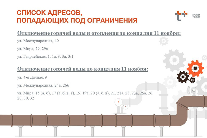 Отключение связано с работами на различных участках теплосетей. На улице 1-й Пионерской и Чернышевского работы планируется завершить до 10:00 12 ноября, на Гвардейской и Мира — до конца дня 11 ноября.