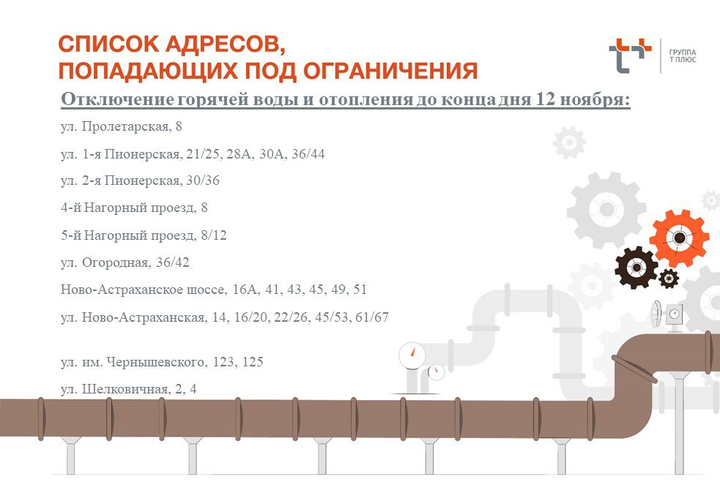 Сегодня, 11 ноября, тысячи жителей Заводского, Ленинского, Октябрьского и Кировского районов Саратова остались без отопления и горячей воды. Об этом сообщили в ПАО «Т Плюс».