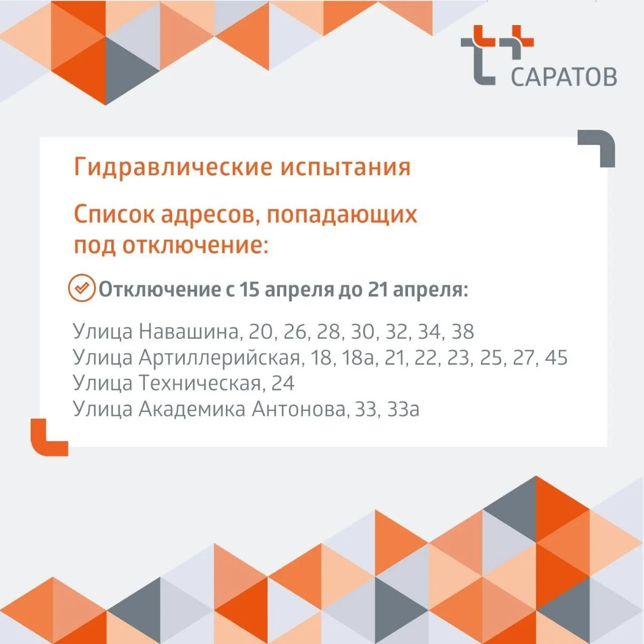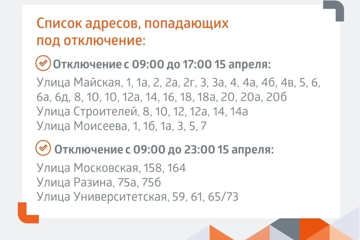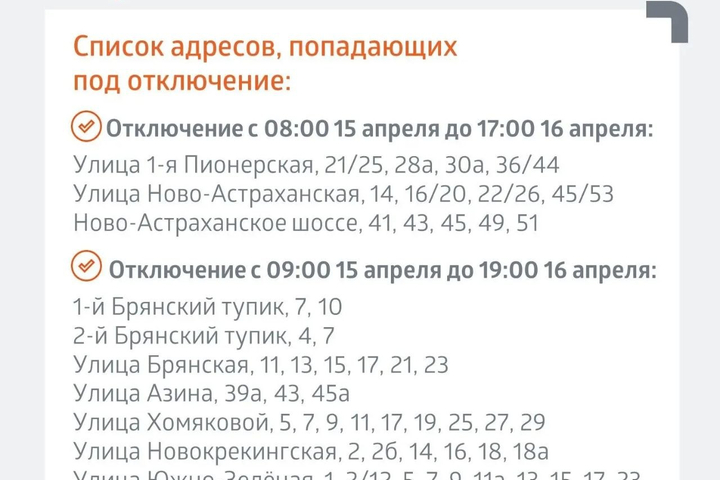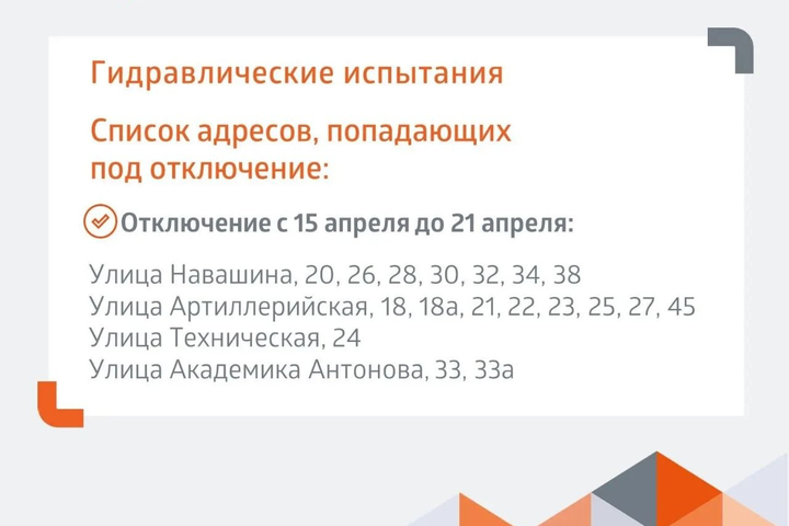 Кроме того, сегодня начинаются гидравлические испытания теплосетей от центральных тепловых пунктов на улицах Тулайкова, Тархова, Артиллерийской и Антонова. С адресами, попадающими под отключение, можно ознакомиться в прикреплённых ниже карточках.