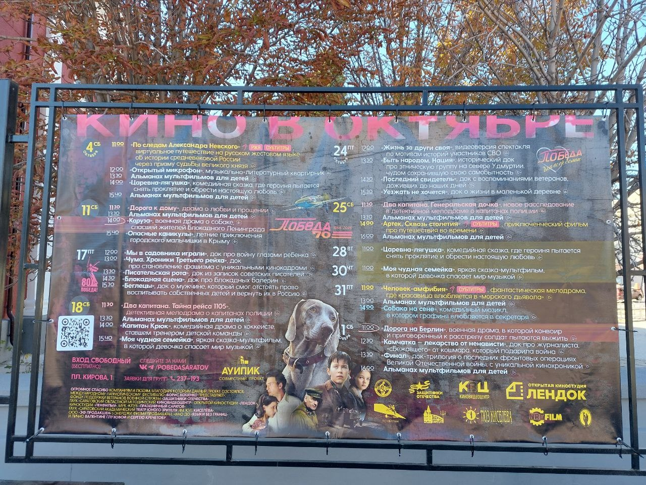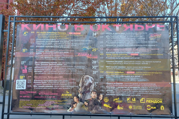 Опубликована афиша на октябрь кинотеатра «Победа» в Саратове. Плакат с обновленным расписанием появился возле здания кинотеатра, кторое находится по адресу площадь Кирова, 1.