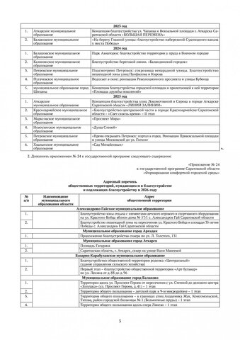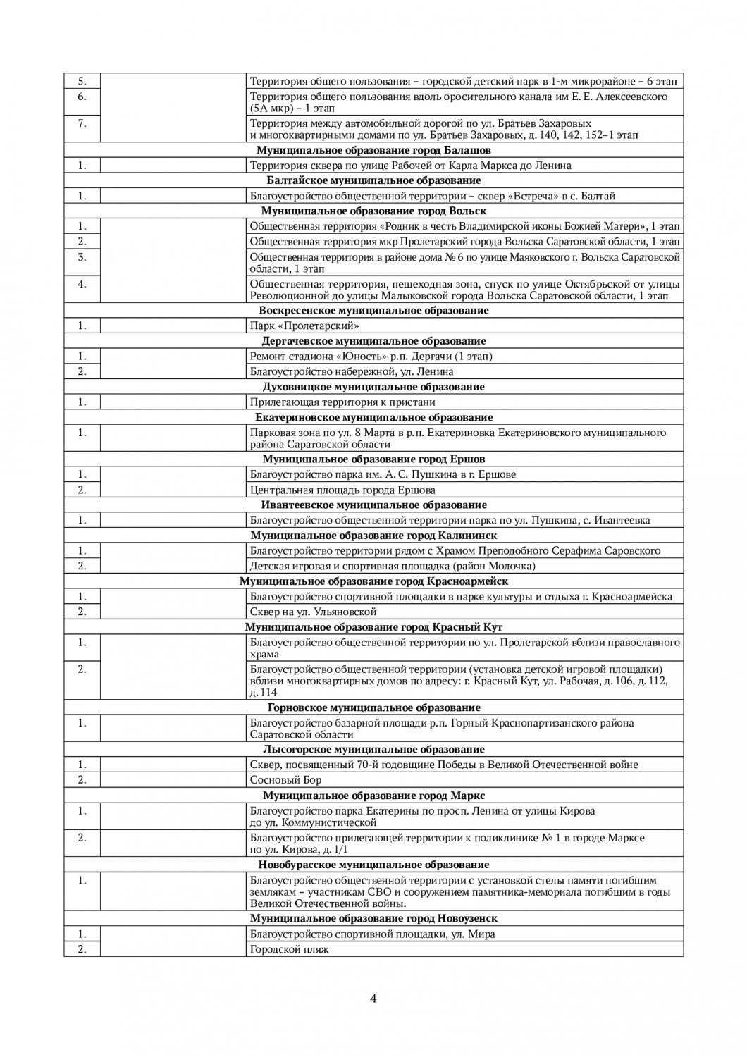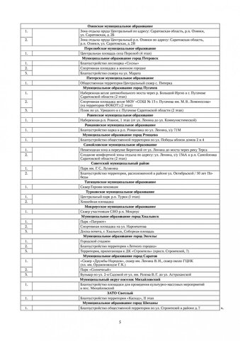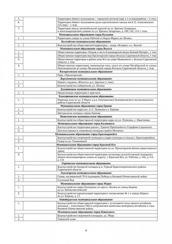 В Энгельсе благоустройство будет вестись на территории Летного городка, на городском стадионе и рядом с ДК «строитель», в Хвалынске — в парке «Патриот», на Соборной площади и улице Наровчатова, в Вольске — на спуске по улице Октябрьской от Революционной до Малыковской, у родника Владимирской иконы Божией Матери, в микрорайоне «Пролетарский», около дома № 6 на улице Маяковской и так далее.