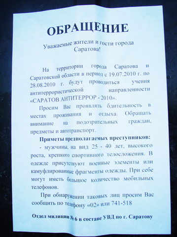 В прошедшие выходные дни саратовцы могли наблюдать весьма странные листовки, расклеенные в городе от имени работников отдела милиции № 6 в составе УВД по городу Саратову. Милиционеры обращались к жителям в связи с проведением на территории области учений "САРАТОВ АНТИТЕРРОР - 2010".