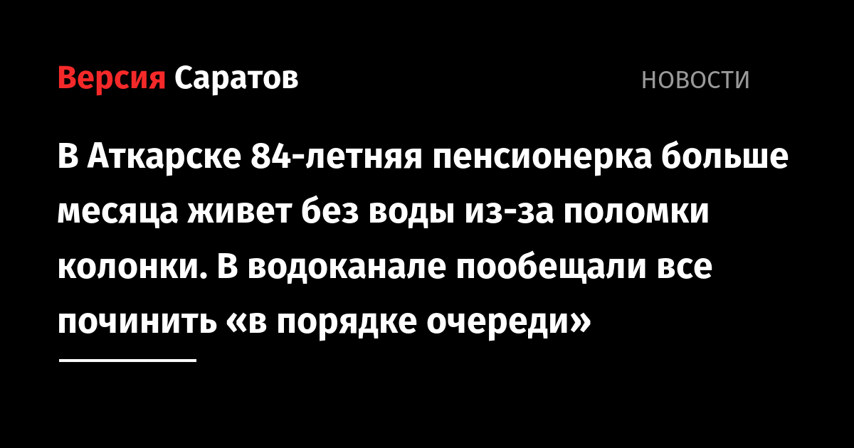 В редакцию ИА «Версия-Саратов» обратилась 81-летняя жительница Аткарска по просьбе своей одинокой 84-летней подруги, у которой нет телефона. По словам нашей читательницы, пожилая женщина проживает в частном доме № 353 на улице Карла Маркса и страдает без воды. У женщины уже больше месяца не работают колонки, а водоканал и местная администрация на мольбы починить их не реагирует.