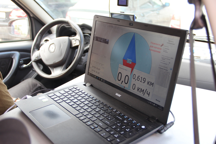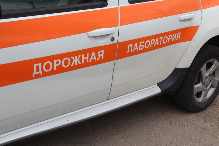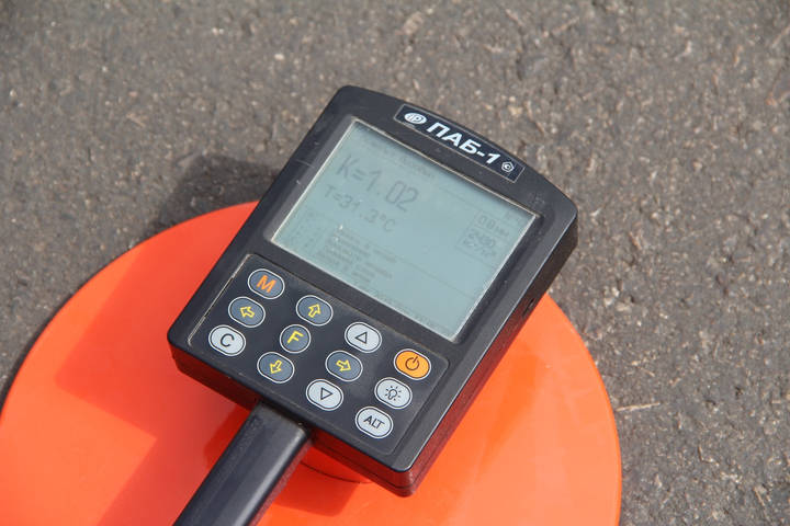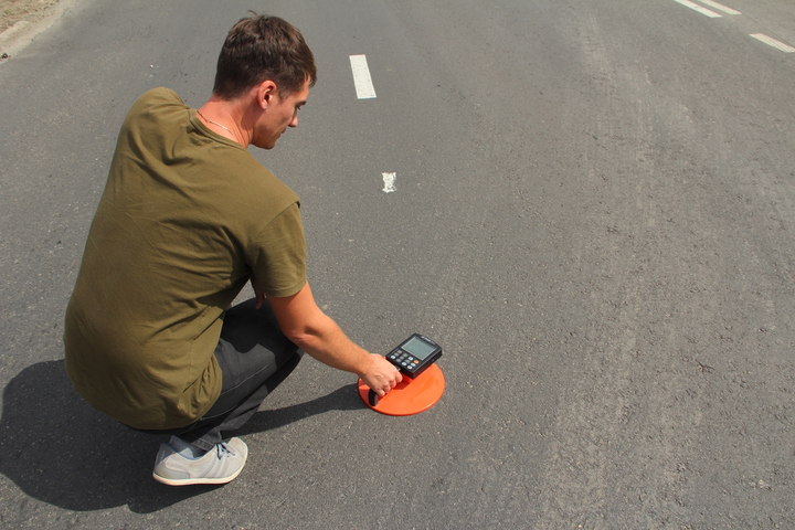 Передвижная дорожная лаборатория проехала по отремонтированному участку. После этого специалист прошел по дороге и в нескольких местах замерил плотность асфальта.