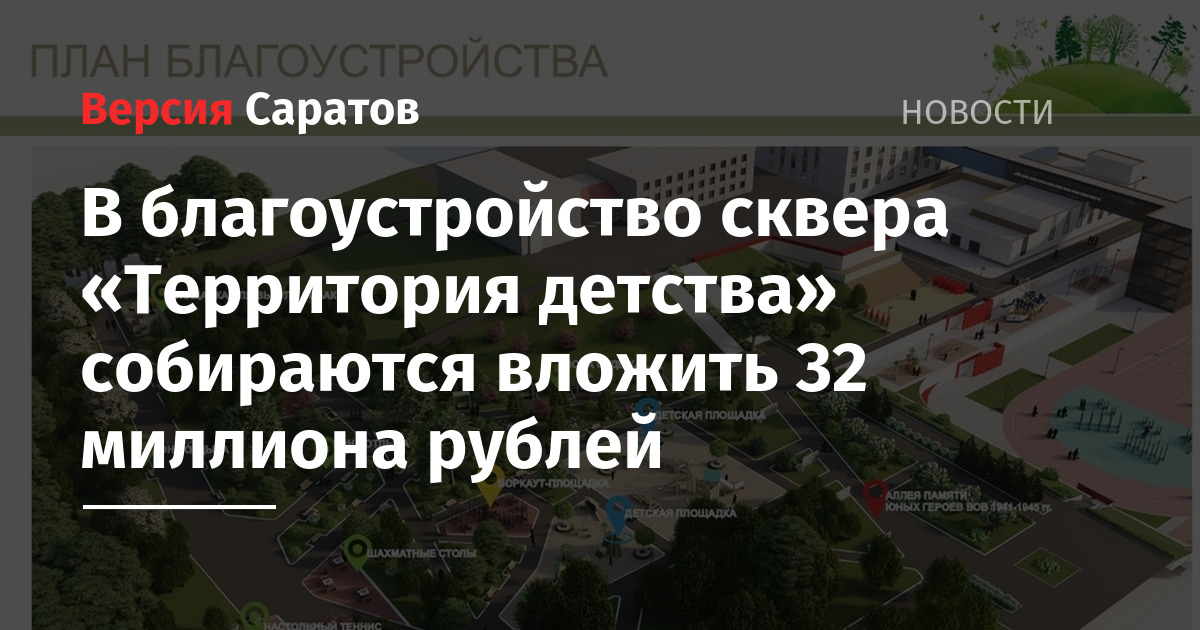 В Саратове собираются вложить 32,85 миллиона рублей в благоустройство сквера «Территория детства» в Ленинском районе. Торги объявила администрация Ленинского района, работы планируется провести с 13 апреля по 31 июля 2026 года.