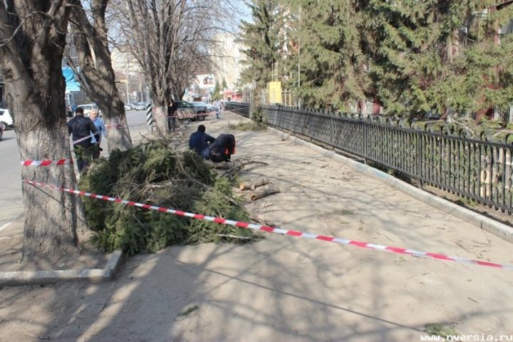 Сегодня утром в центре Саратова на улице Советской возле корпуса Аграрного университета были спилены несколько больших елей. Деревья находились на огражденной территории возле здания вуза. Целыми остались лишь три ели. В настоящее время стволы и ветки распилены и приготовлены к вывозу.