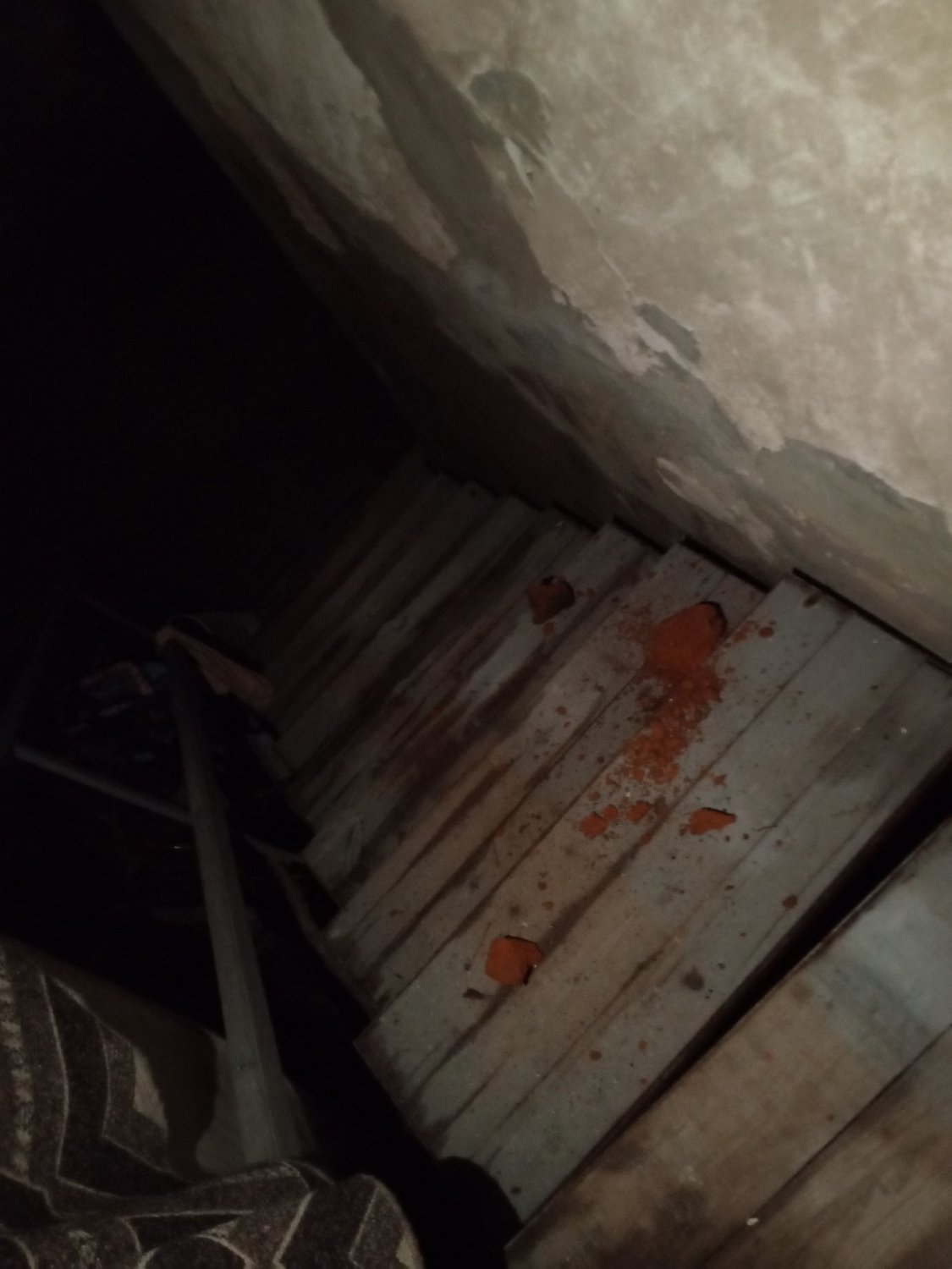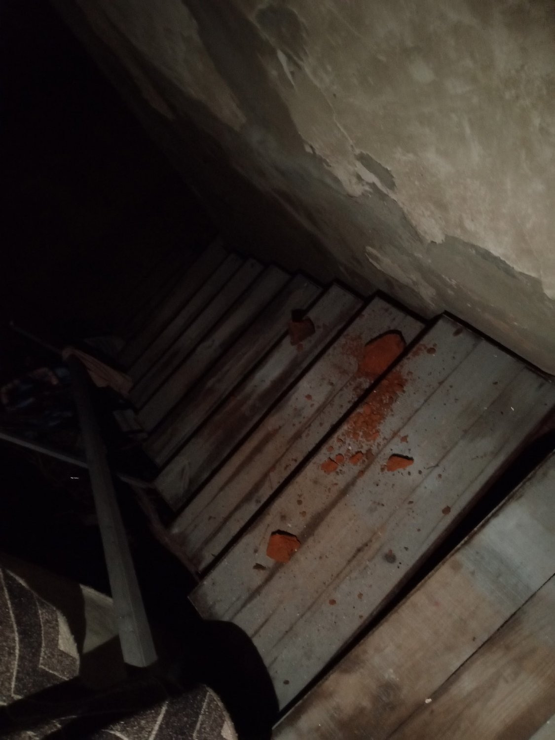 Также она поделилась фото. На одном из них, по словам горожанки, видно ссадину на руке после описанного инцидента. На двух других — упавший на лестницу в подъезде и разлетевшийся на куски кирпич. Стоит отметить, что и сама лестница, на которую он упал, выглядит не очень безопасной для передвижения.