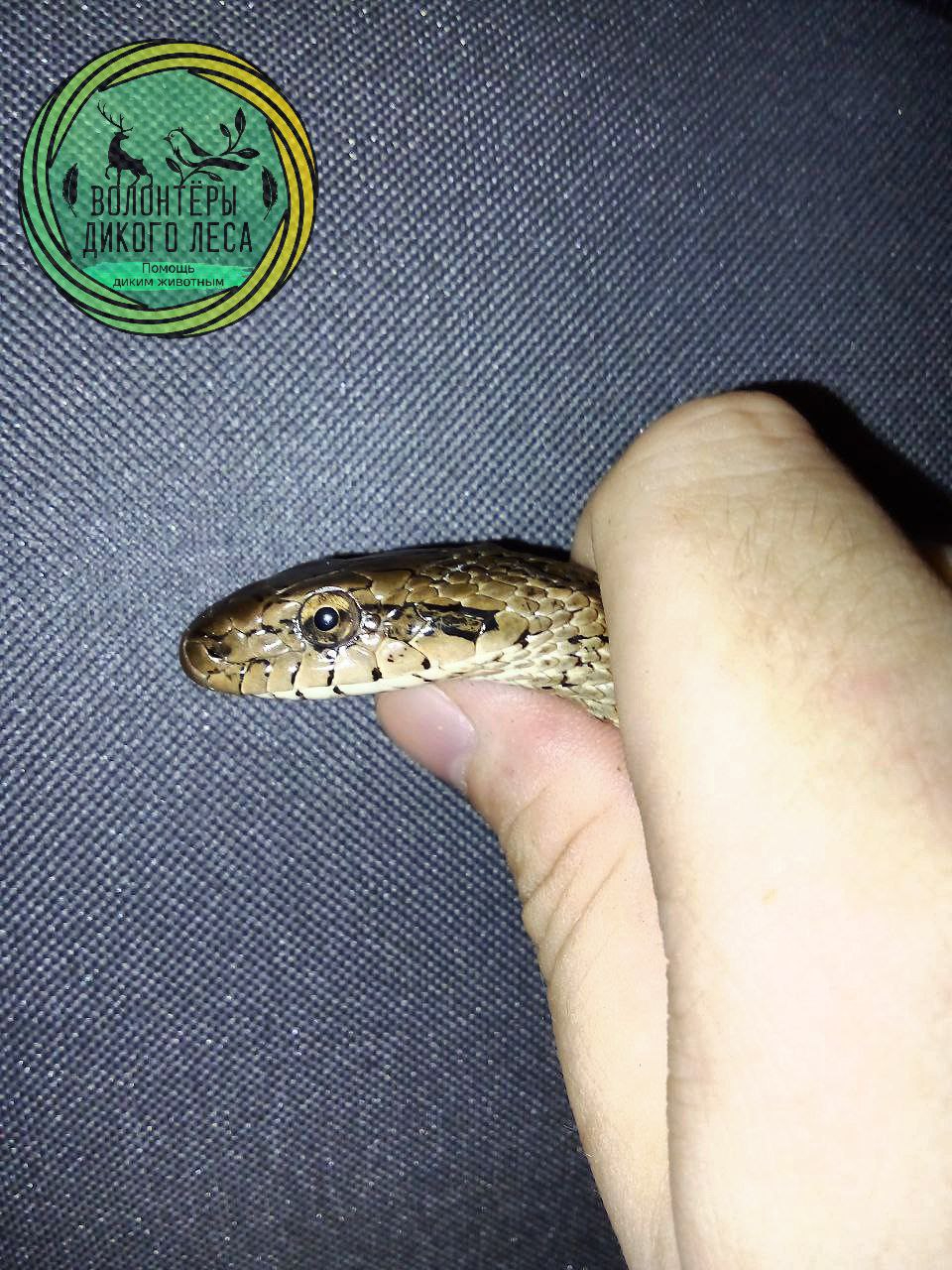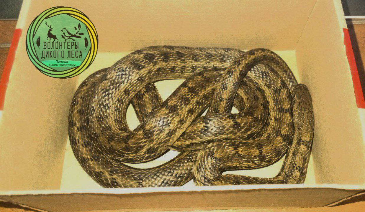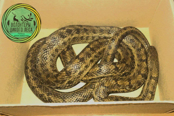 Как сообщили волонтеры, в реальности страшная змея оказалась неядовитой самкой узорчатого полоза.