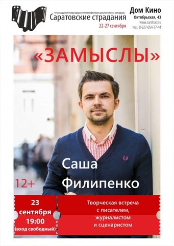 В грядущую субботу – 23 сентября – в Доме кино состоится творческая встреча с писателем Сашей Филипенко. Мероприятие проводится в рамках фестиваля "Саратовские страдания".