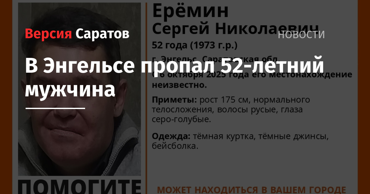 Пропал 52-летний Сергей Еремин. Его местонахождение неизвестно с 6 октября 2025 года. Рост пропавшего составляет 175 сантиметров, он нормального телосложения, у него русые волосы и серо-голубые глаза. В день исчезновения на нем были темная куртка, темные джинсы, бейсболка.
