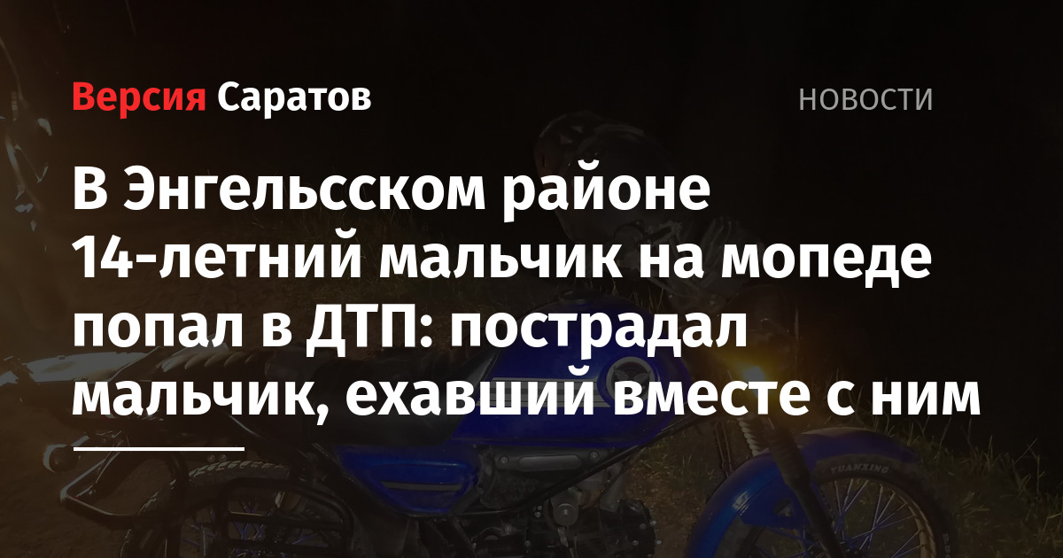 В Энгельсском районе вчера вечером произошло ДТП с участием несовершеннолетнего водителя мопеда. По информации регионального управления ГИБДД, 14-летний подросток сел за руль двухколесного транспортного средства, и в результате произошло столкновение с автомобилем Renault Kaptur. Авария произошла на 2-м километре автодороги Прибрежный — Шумейка — Генеральское. За рулем иномарки находился 40-летний водитель.