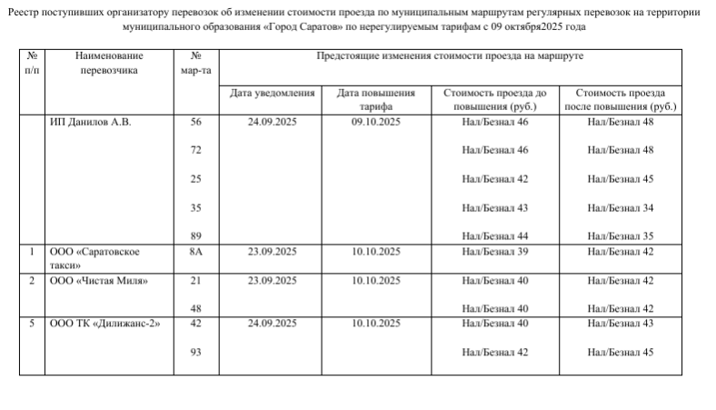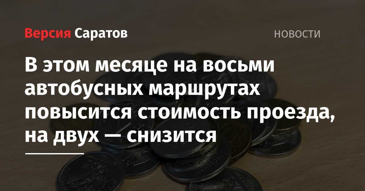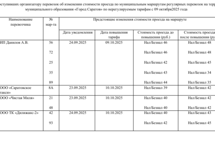 ООО «Саратовское такси» уведомило, что с 10 октября на маршруте № 8А стоимость проезда вырастет на три рубля — с 39 до 42. В этот же день, сообщает ООО «Чистая Миля», на два рубля — с 40 до 42 — станет дороже передвигаться на маршрутах № 21 и № 48. ООО ТК «Дилижас-2» предупредило, что с 10 октября с 40 до 43 рублей увеличится стоимость проезда на маршруте № 42, а с 42 до 45 — на маршруте № 93.