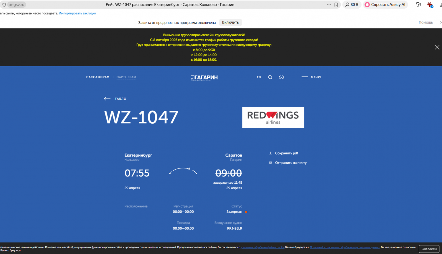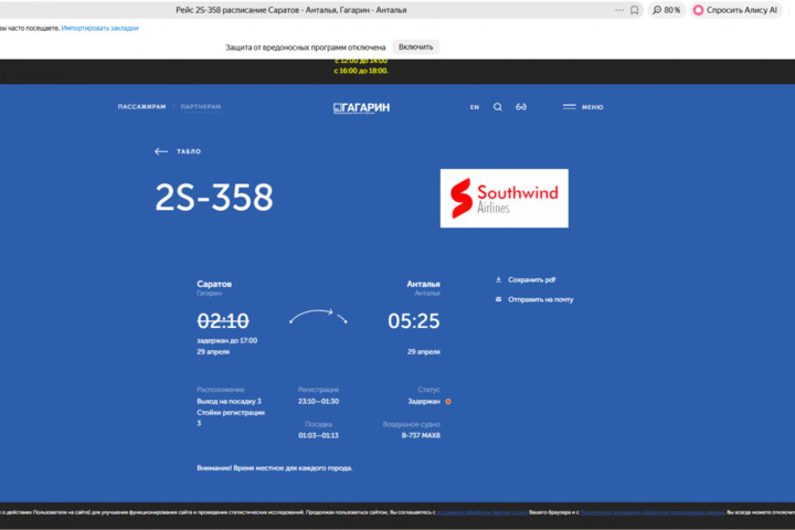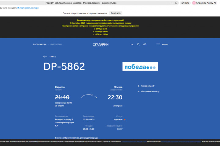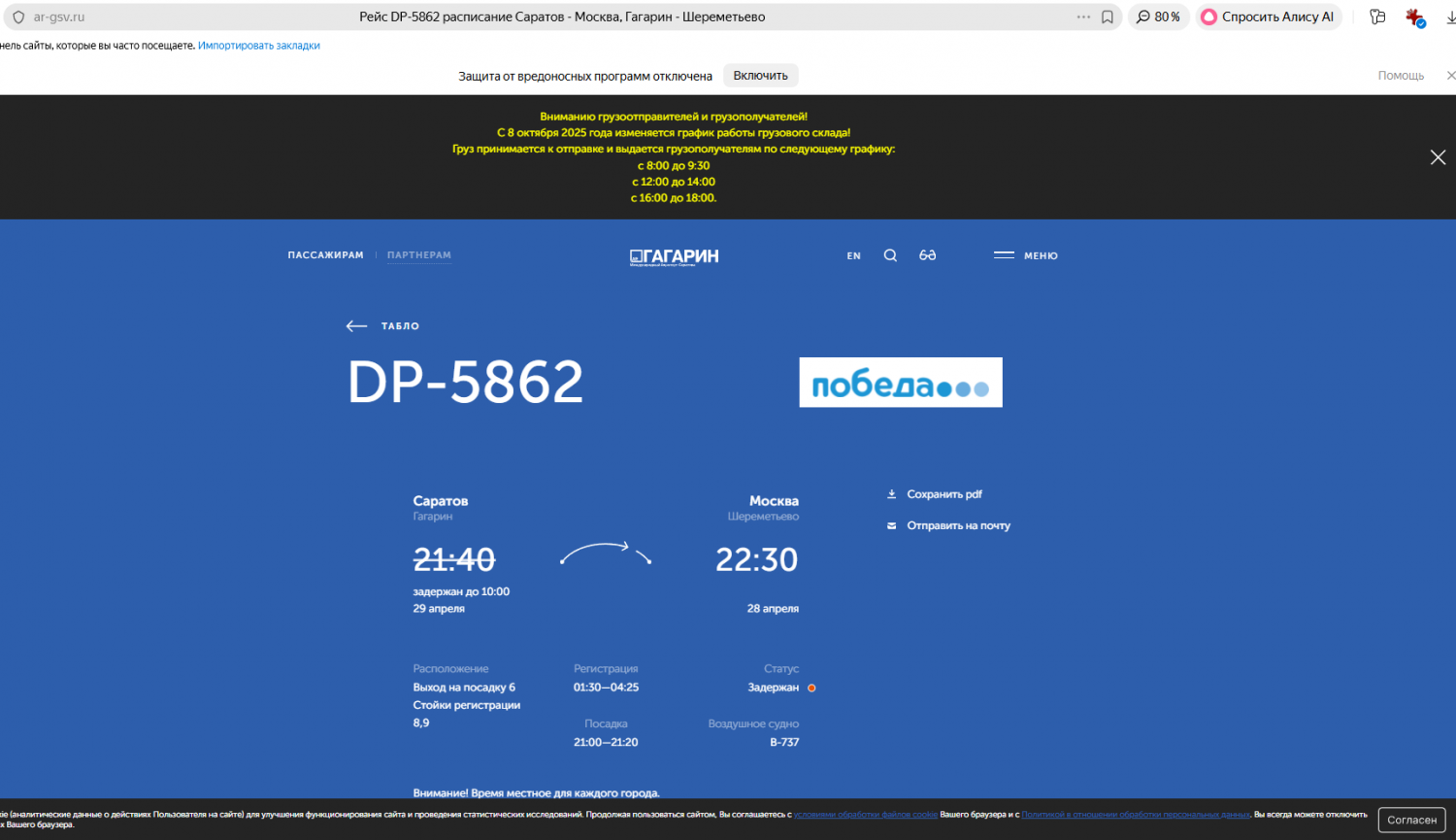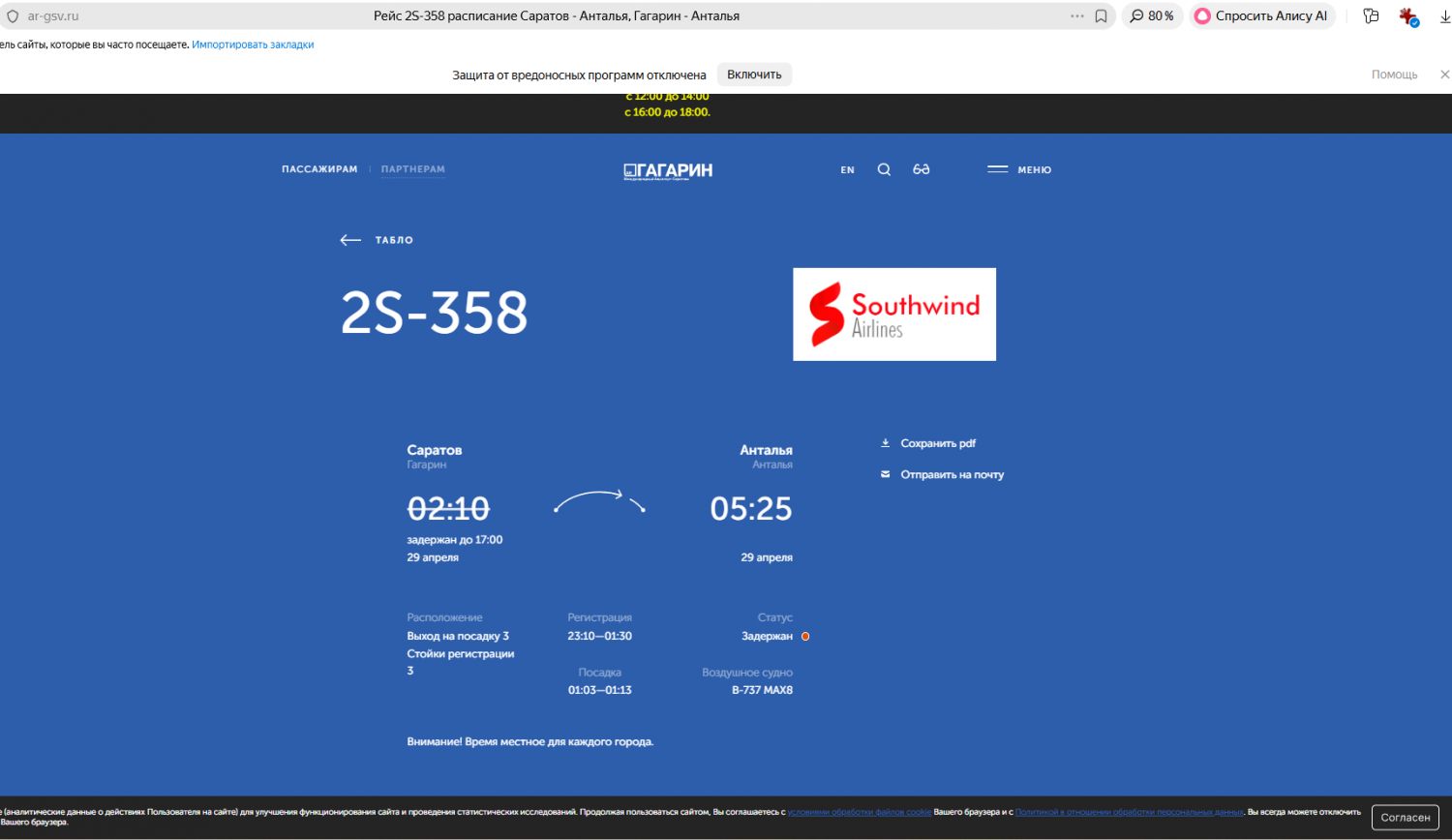 - Два рейса в саратовском «Гагарине» задерживаются на 19 часов