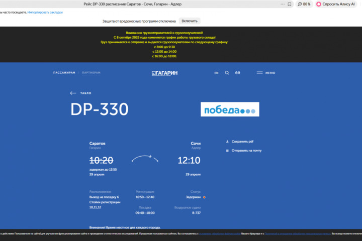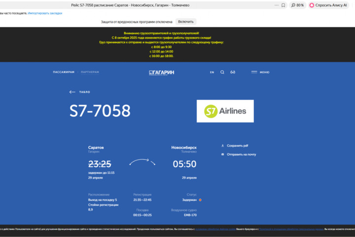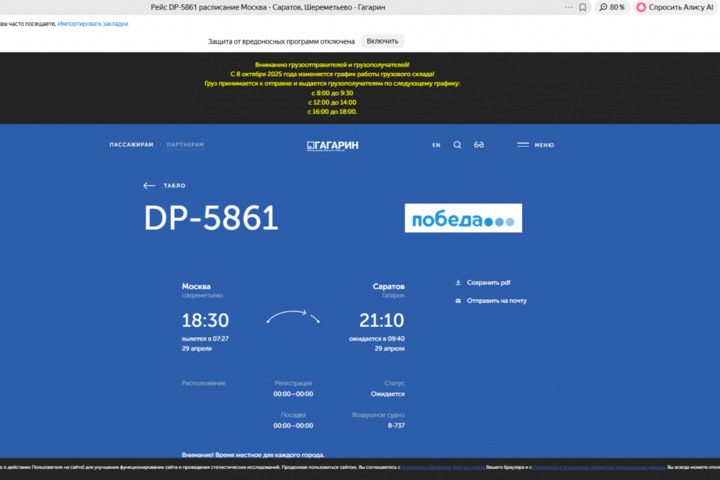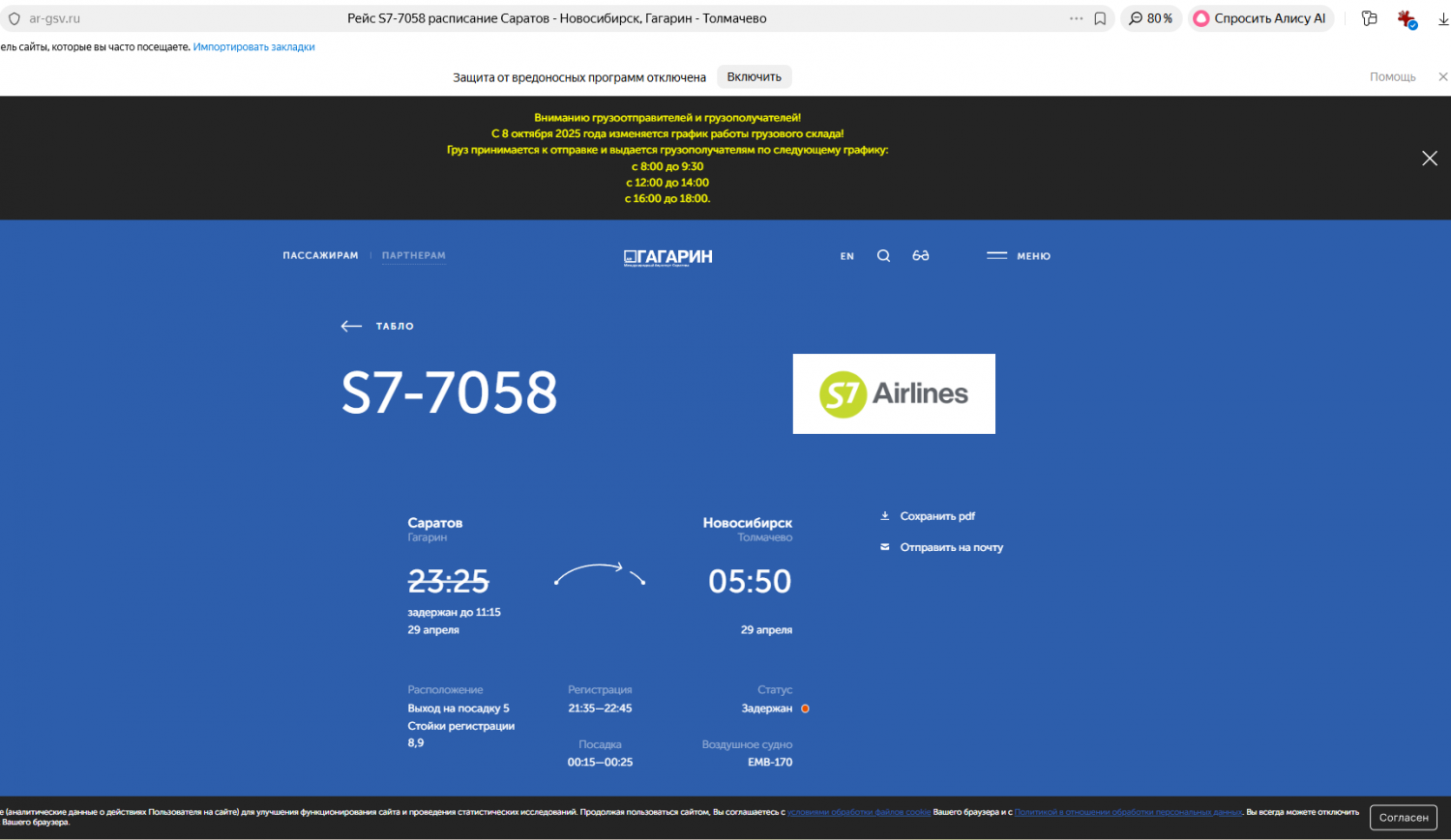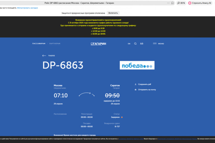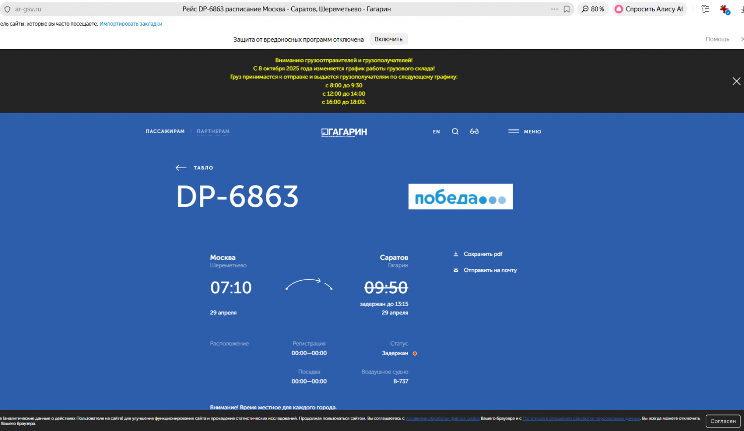 - Два рейса в саратовском «Гагарине» задерживаются на 19 часов
