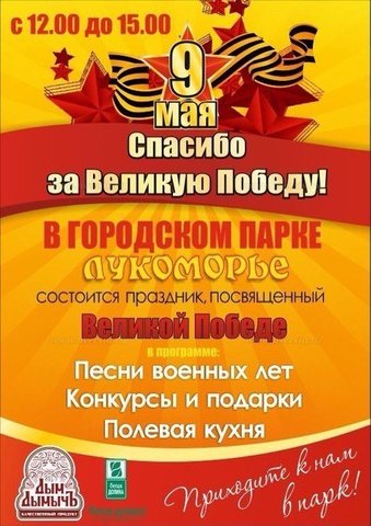 В субботу, 9 мая, в Городском парке Саратова состоится праздник, приуроченный ко Дню Победы. В программе — песни военных лет и танцевальные номера. Все желающие смогут принять участие в конкурсах и получить призы и подарки. Для посетителей будет организована полевая кухня.