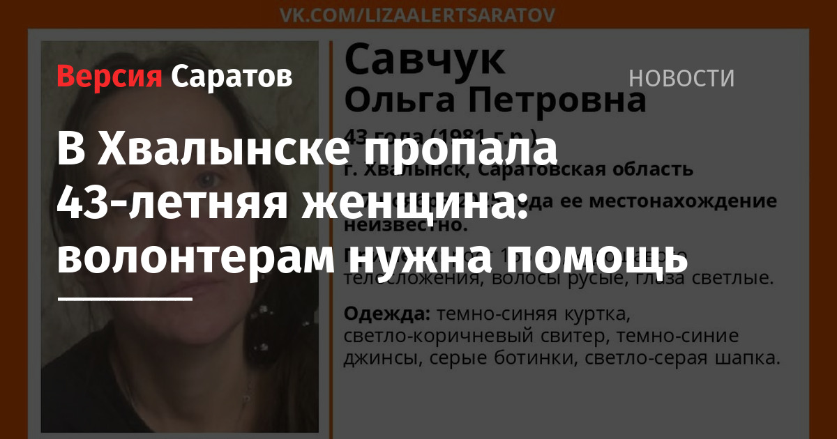 В Хвалынске пропала 43-летняя Ольга Савчук. Волонтеры просят помощи в ее поисках. Об этом рассказали в Telegram-канале «ДПСО „ЛизаАлерт“ Саратовской области».