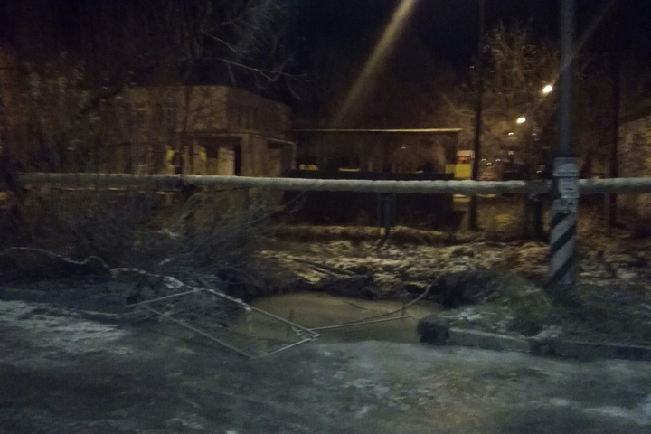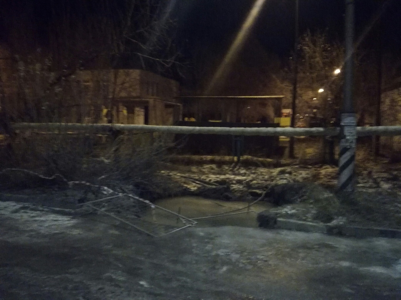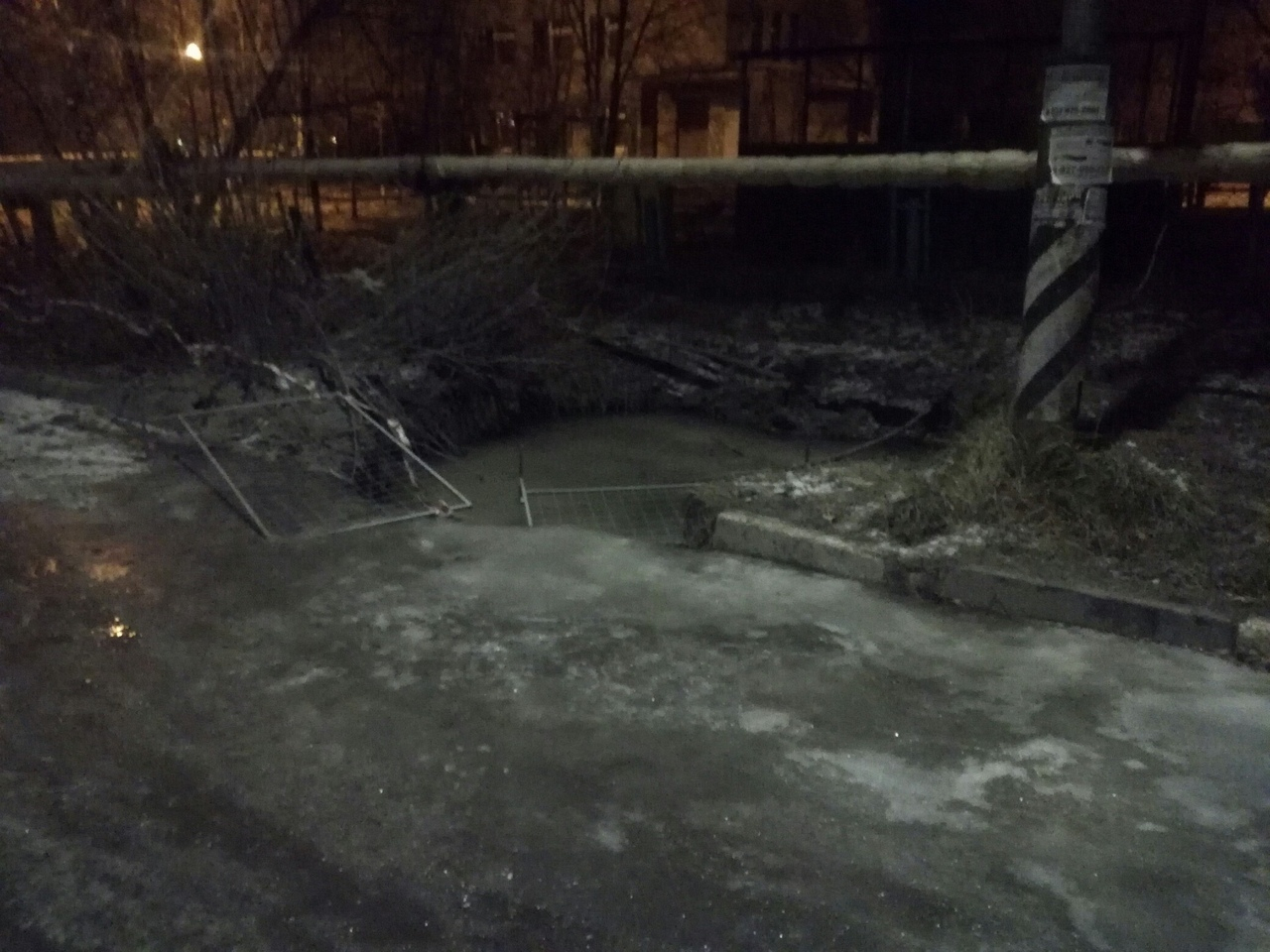 На фотографиях снят большой котлован, залитый водой. Он обледенел так же, как и находящаяся рядом проезжая часть. Огромную яму, очевидно, пытались огородить сигнальными лентами, но ограждение упало. «Ждем трагедии», — констатировал автор поста.