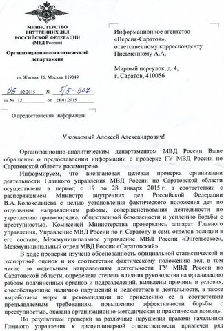 В МВД РФ рассказали об итогах проверки, которая проводилась в саратовском областном управлении ведомства в период с 19 по 28 января 2015 года. Как выяснилось, инспекция была внеплановой, распоряжение о ее проведении подписал министр внутренних дел России Владимир Колокольцев. В результате мероприятия силовики планировали узнать, как реально обстоят дела в саратовском главке, а также укрепить правопорядок и усилить борьбу с преступностью. Проверке подверглись главное управление региона, управление по Саратову, семь районных отделов полиции, а также МУ МВД "Энгельсское" и МО МВД "Саратовский".