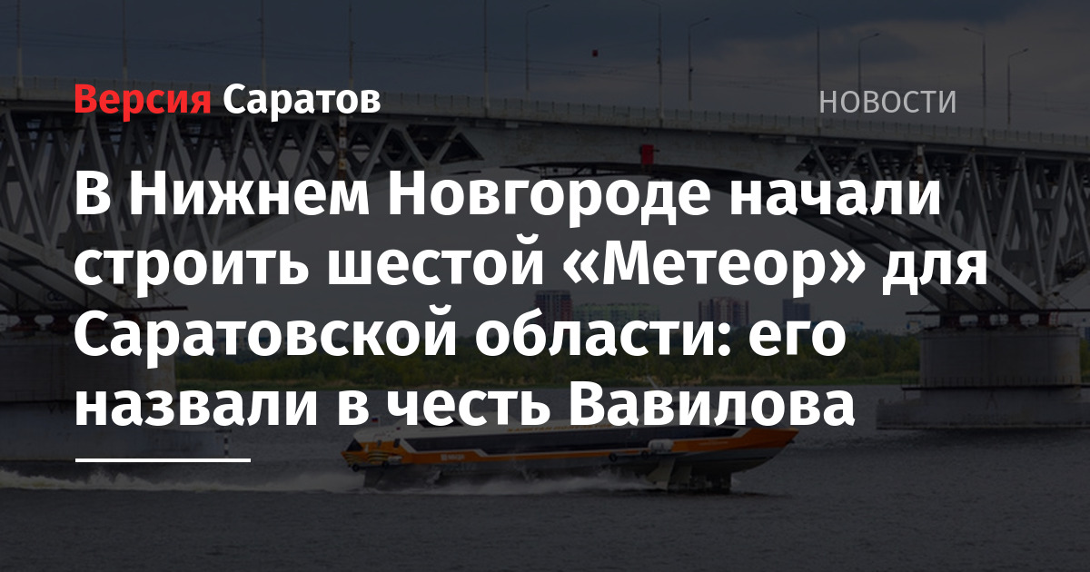 Завод-изготовитель в Нижнем Новгороде приступил к строительству нового пассажирского судна на подводных крыльях «Метеор» для Саратовской области. Об этом сообщил губернатор Роман Бусаргин. Судно будет носить имя ученого-генетика Николая Вавилова. Планируется, что этот «Метеор» будет курсировать по маршруту Саратов-Хвалынск.