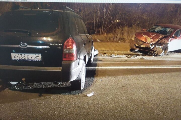 В Саратове на улице Брянской сегодня около двух часов ночи произошло ДТП. Напротив дома № 1а столкнулись Hyundai и Nissan.