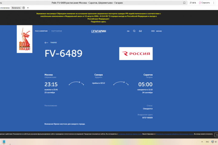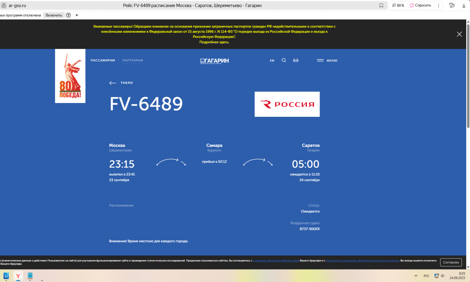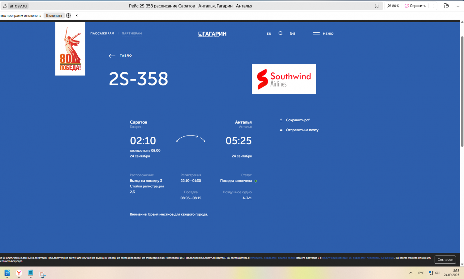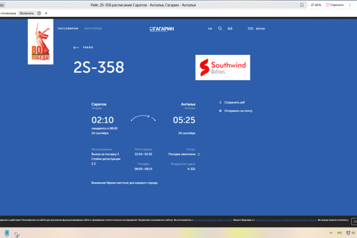 Самолёт из Саратова в Анталью должен был вылететь в 2:10, но вылетел в 8:00. Время вылета судна до столицы сместили с 6:30 на 12:30.