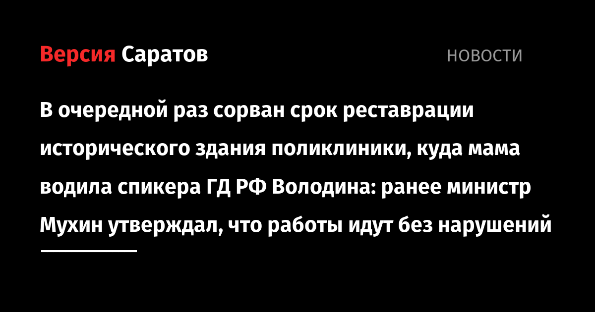 В Вольске вновь был сорван срок реставрации исторического здания бывшей поликлиники, в которую мама водила спикера ГД РФ Вячеслава Володина, когда он был ребенком. Речь идет о здании расположенном по адресу улица Саши Евсеева, 2, которое является объектом культурного наследия и числится в реестре, как «Здание больницы, 1910–1913 гг.».