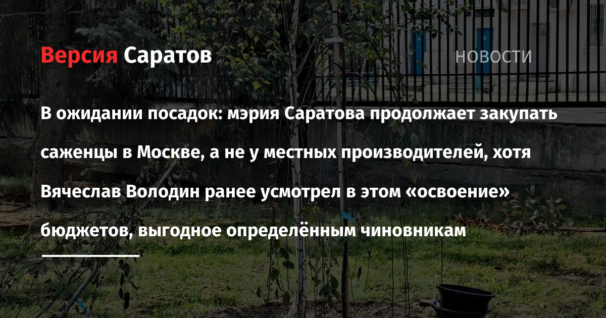 Саратовские чиновники могут подозрительным образом осваивать средства за счёт госконтрактов по поставке саженцев для городских парков и скверов. Это следует из ряда договоров, заключенных с московскими поставщиками. При том, что ещё в октябре 2025 года спикер Госдумы Вячеслав Володин раскритиковал местные власти за то, что те не закупают растения, кустарники и деревья для высадки в парках и скверах непосредственно в Саратове, чем саботируют создание и развитие местных питомников.