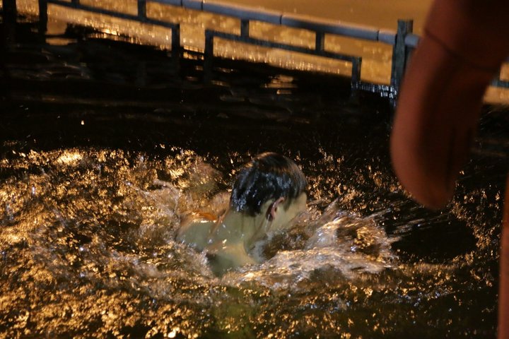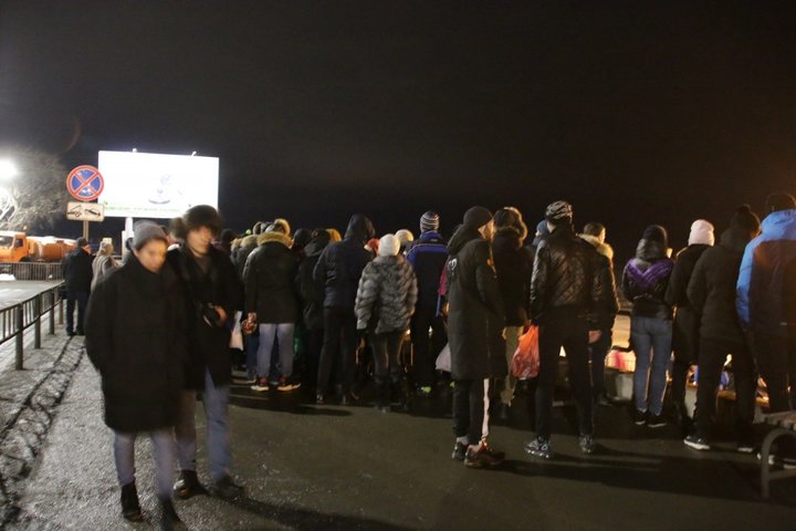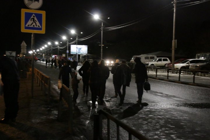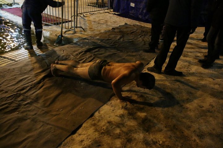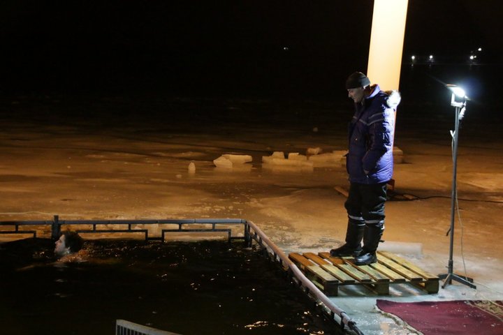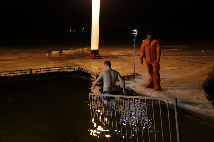 Для того, чтобы обеспечить порядок в зоне купания, полицейские пускали желающих к берегу в порядке очереди. Желающие искупаться столпились около прохода. По приблизительным подсчетам в Затоне собралось чуть более 100 человек. И зрители, и те, кто окунулся в ледяную воду, возвращались пешком.