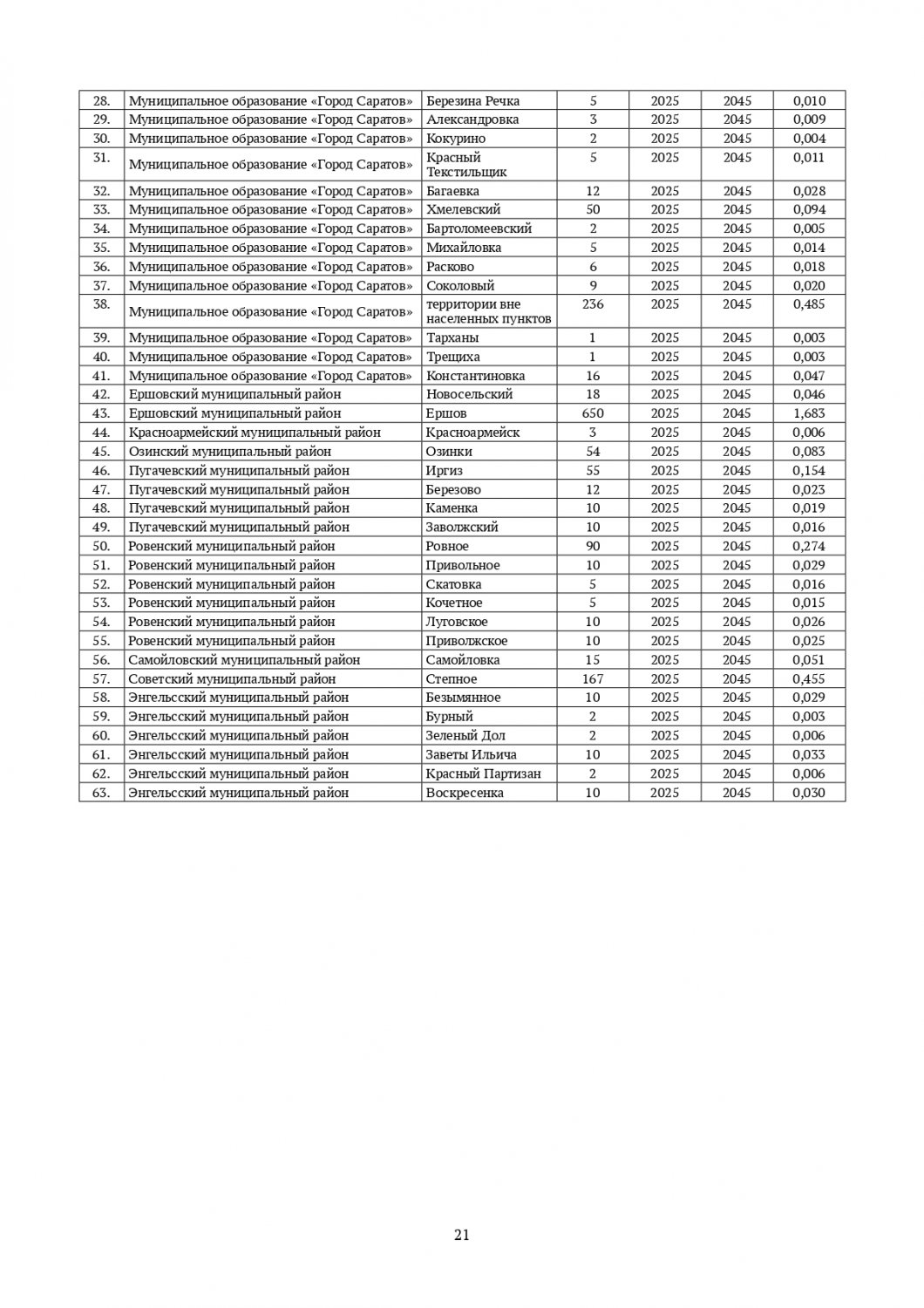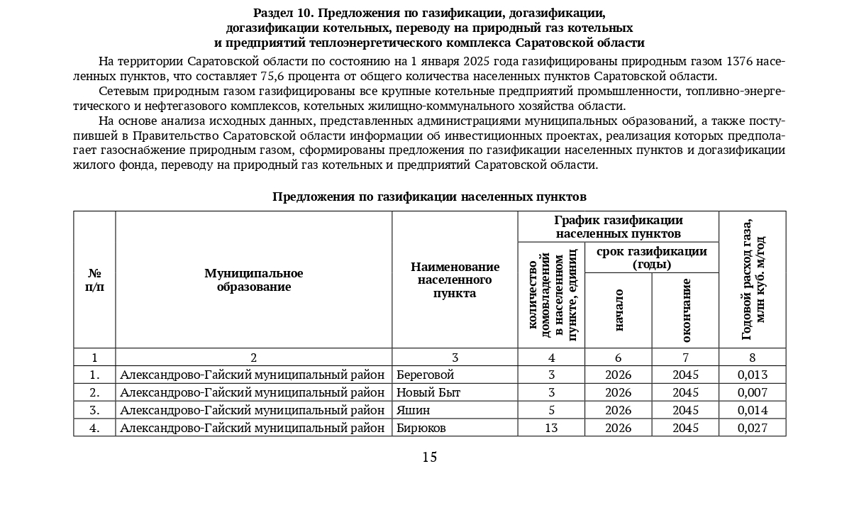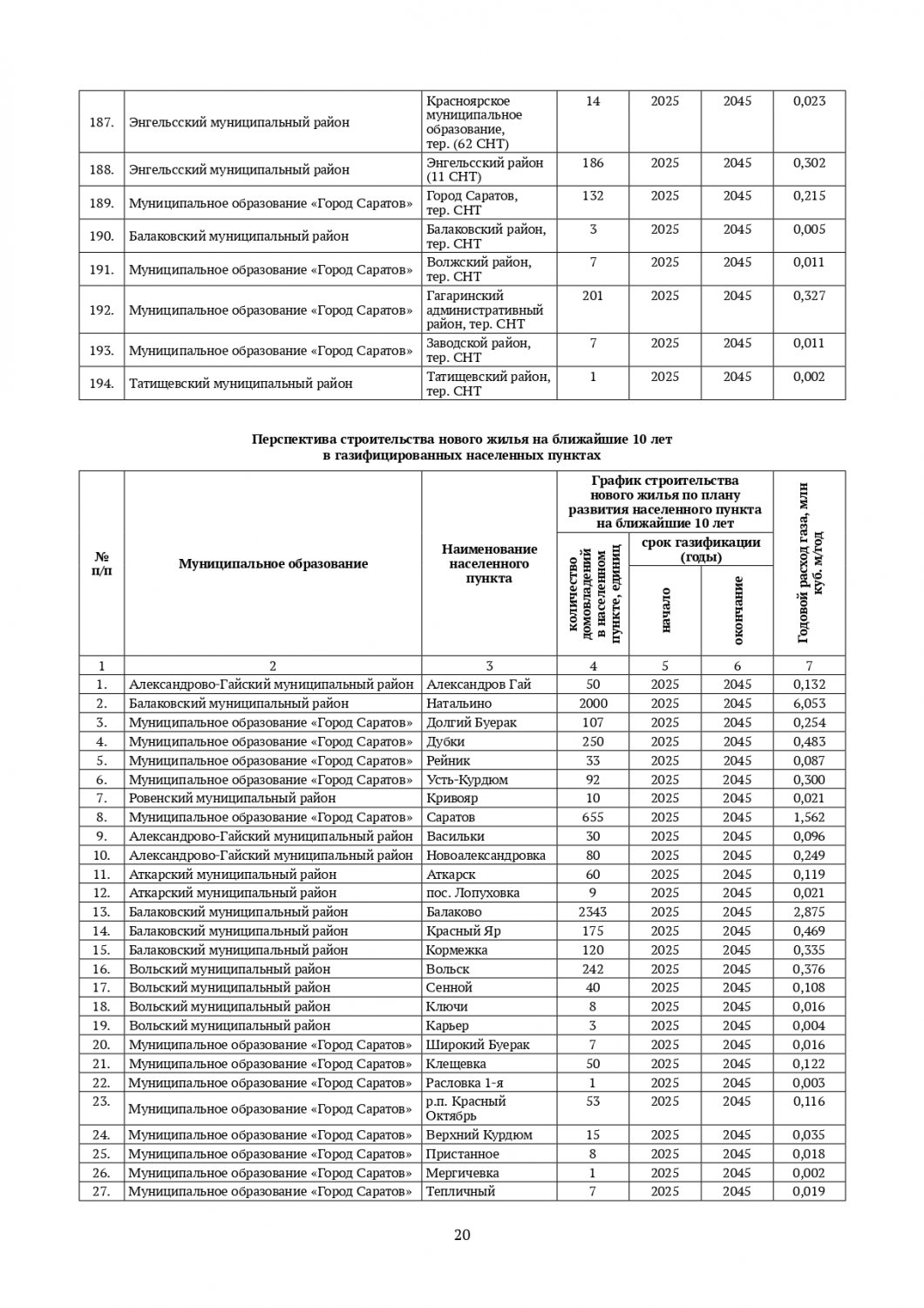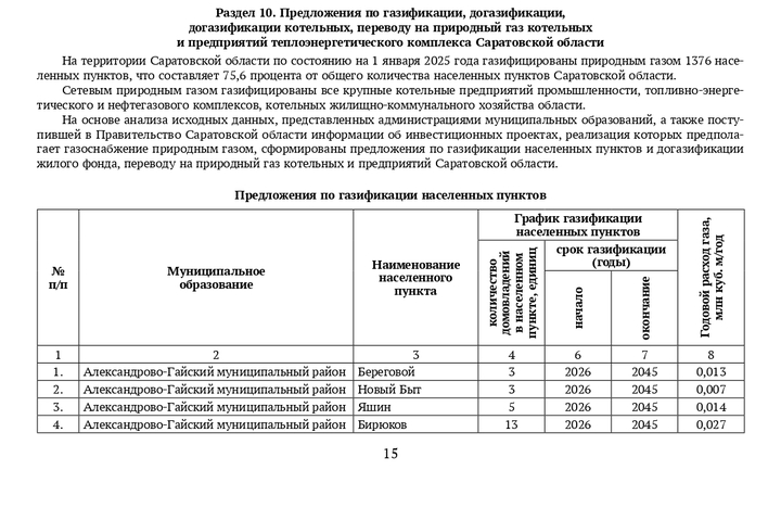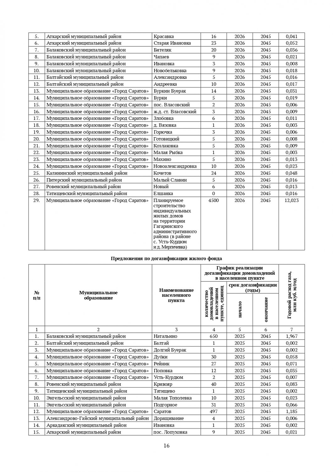 На 2025–2045 годы подготовлены предложения по газификации населенных пунктов, где насчитывается менее 25 жилых домов. В Саратове к список попали Буркин Буерак, Бурки, поселок Власовский, Злобовка, Вязовка, Горючка, Готовицкий, Козлаковка, Малая Рыбка, Махино, Новоалександровка (в этих малых деревнях Гагаринского района от 1 до 14 домов).