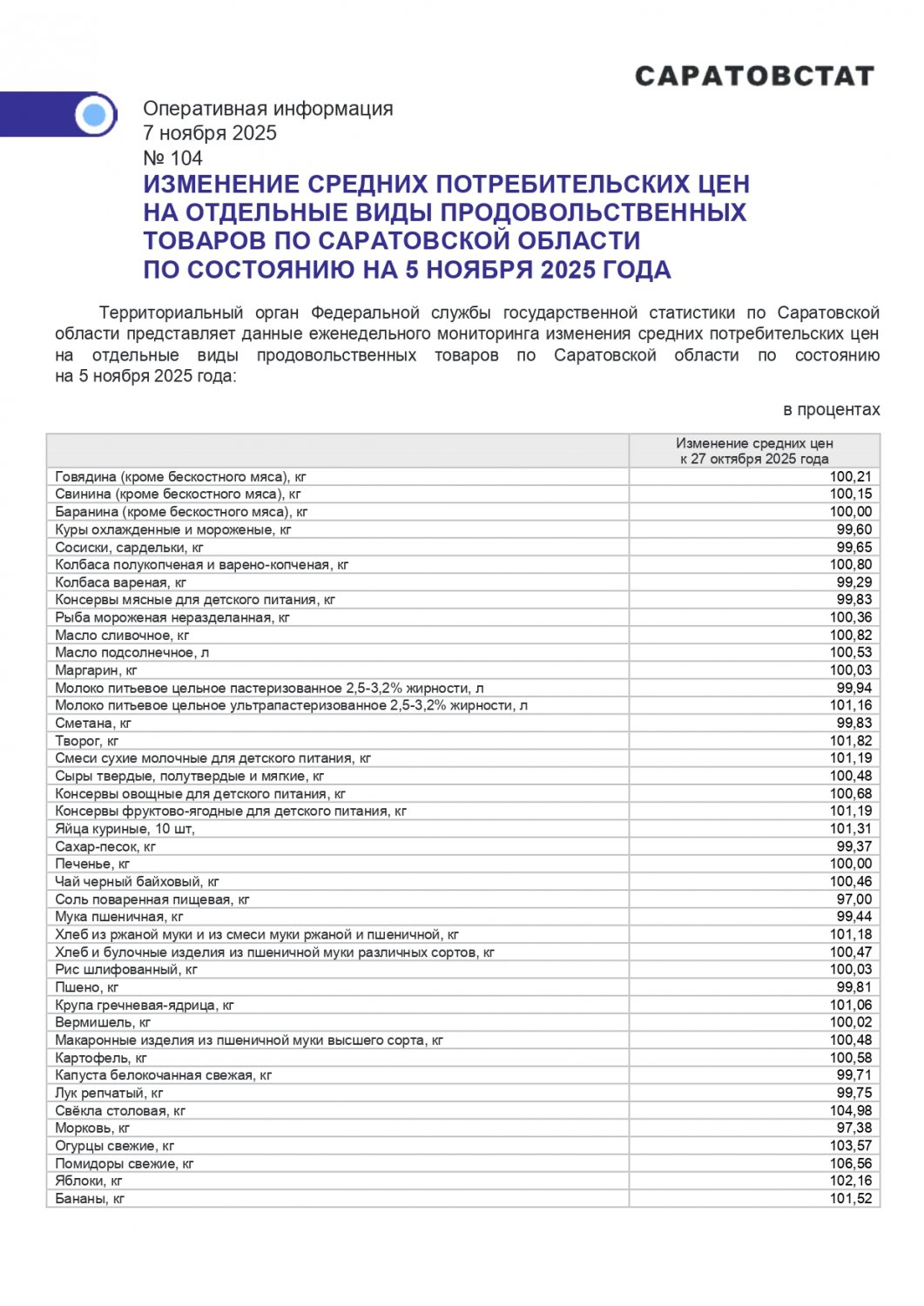 В Саратовской области за неделю выросли цены сразу на 12 основных видов продуктов, снизились — только на 2. Данные еженедельного мониторинга изменения средних потребительских цен на отдельные виды продовольственных товаров, актуальные на 5 ноября, опубликовал в конце прошлой недели Саратовстат.