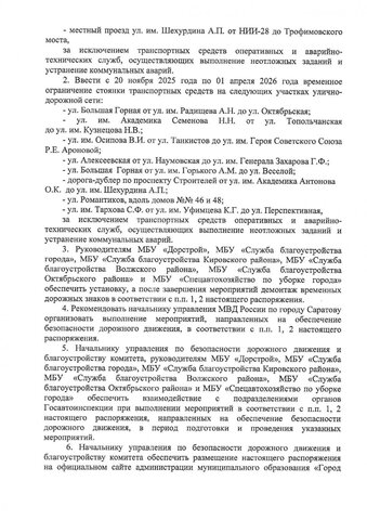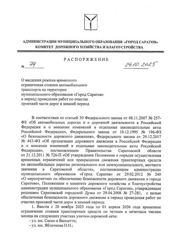 Временный запрет парковки, а также ограничения стоянки транспортных средств по четным и нечетным числам будут действовать с 20 ноября 2025 года по 1 апреля 2026 года. В комитете дорожного хозяйства и благоустройства заявляют, что это нужно для вывоза снега. «Чтобы техника могла работать без помех, временно вводятся ограничения на остановку. Эти решения принимаются на основе опыта прошлых лет. Надеемся, что горожане с пониманием отнесутся к этим мерам», — привели в Telegram-канале «Саратов транспортный» комментарий председателя комитета Андрея Бондарева.