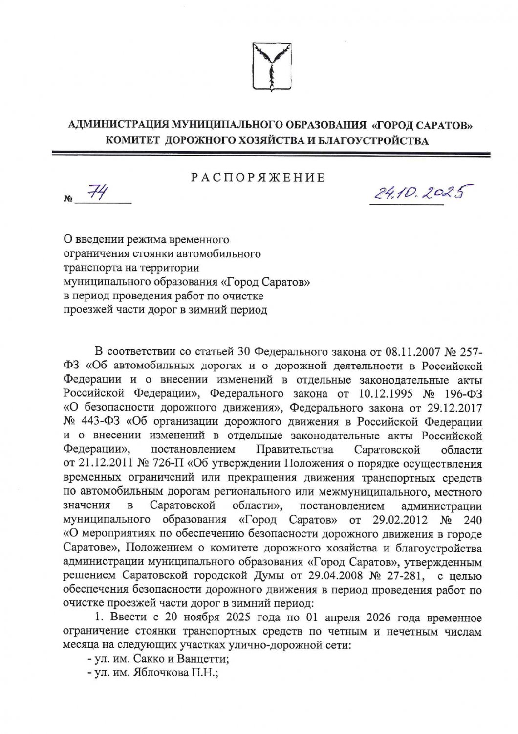 Временный запрет парковки, а также ограничения стоянки транспортных средств по четным и нечетным числам будут действовать с 20 ноября 2025 года по 1 апреля 2026 года. В комитете дорожного хозяйства и благоустройства заявляют, что это нужно для вывоза снега. «Чтобы техника могла работать без помех, временно вводятся ограничения на остановку. Эти решения принимаются на основе опыта прошлых лет. Надеемся, что горожане с пониманием отнесутся к этим мерам», — привели в Telegram-канале «Саратов транспортный» комментарий председателя комитета Андрея Бондарева.